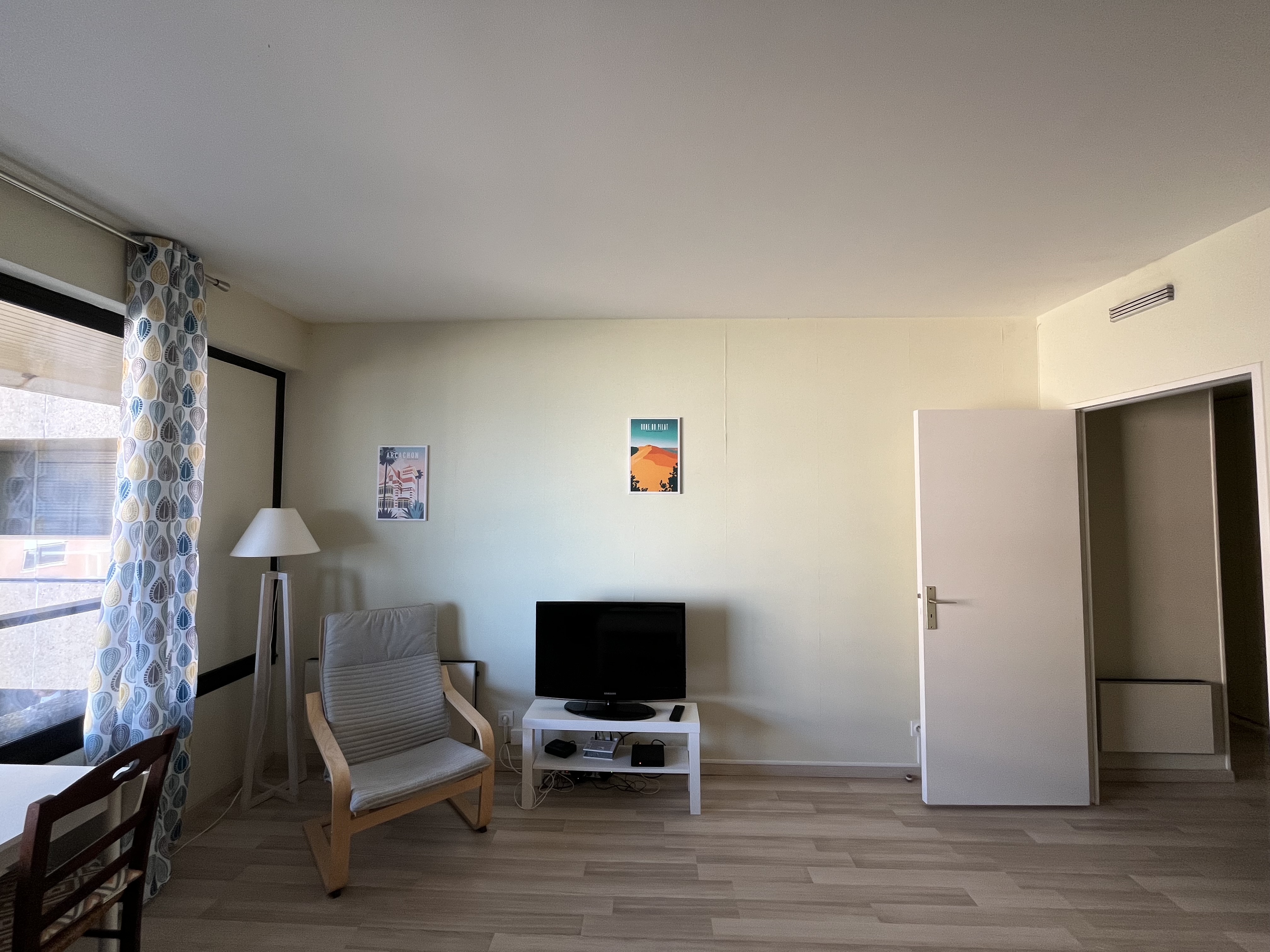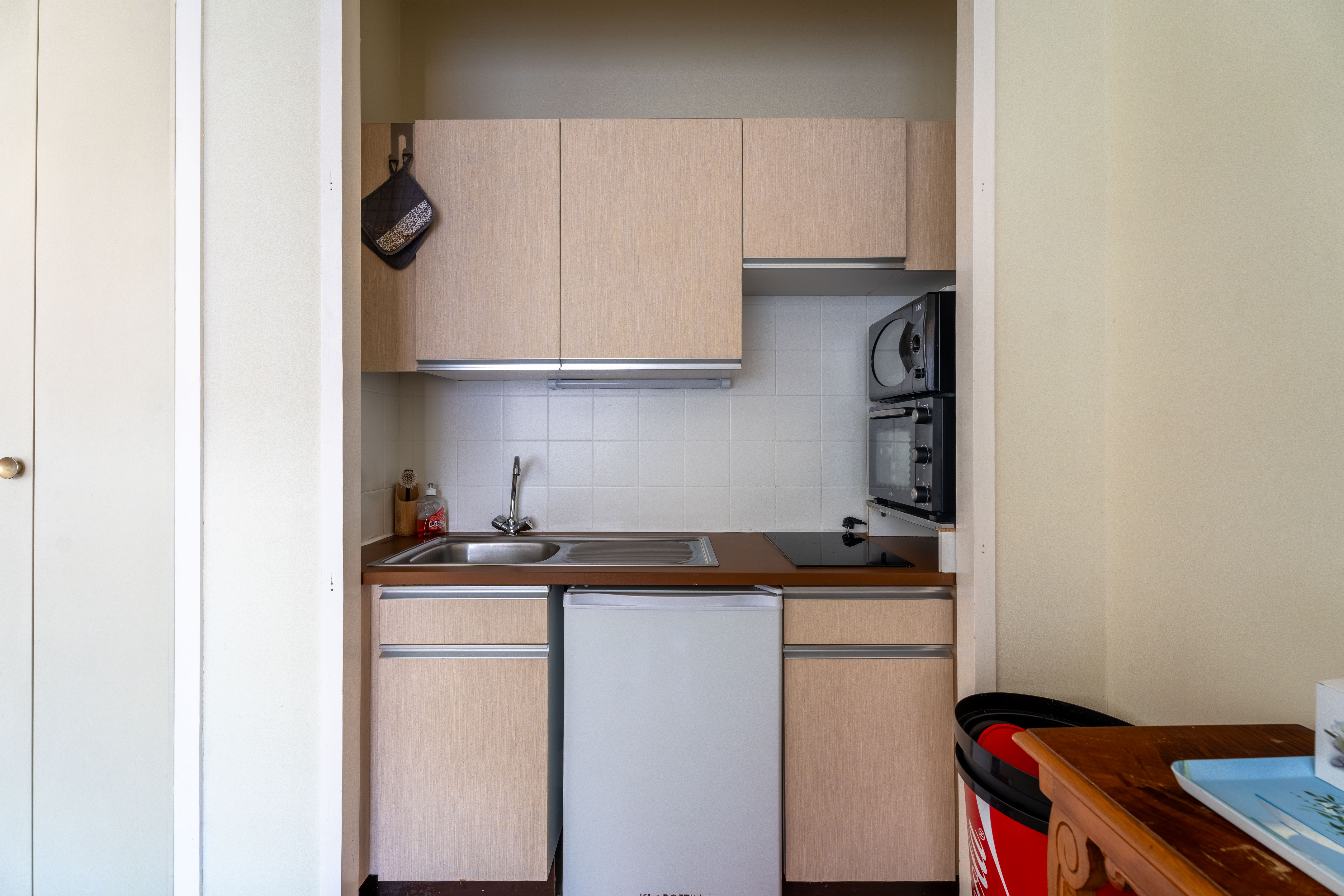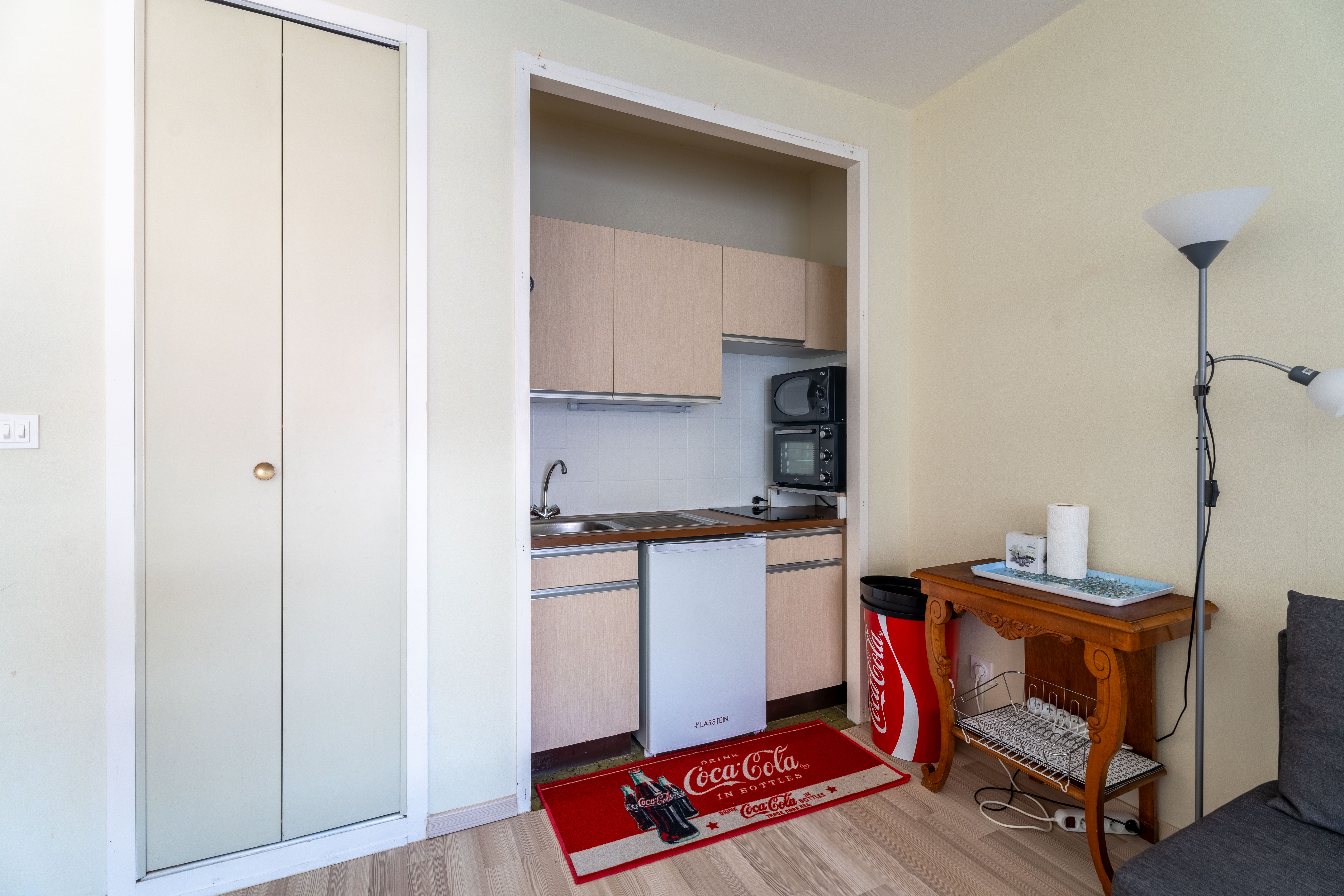 Dans l’entrée de ce studio, vous trouverez de nombreux placards menant à la pièce de vie qui vous offre deux couchages dans son canapé convertible en 140, vous disposez d’une TV et du WIFI et d’une kitchenette équipée avec plaques de cuisson, mini four, micro-ondes, frigo Top et cafetière Senseo.