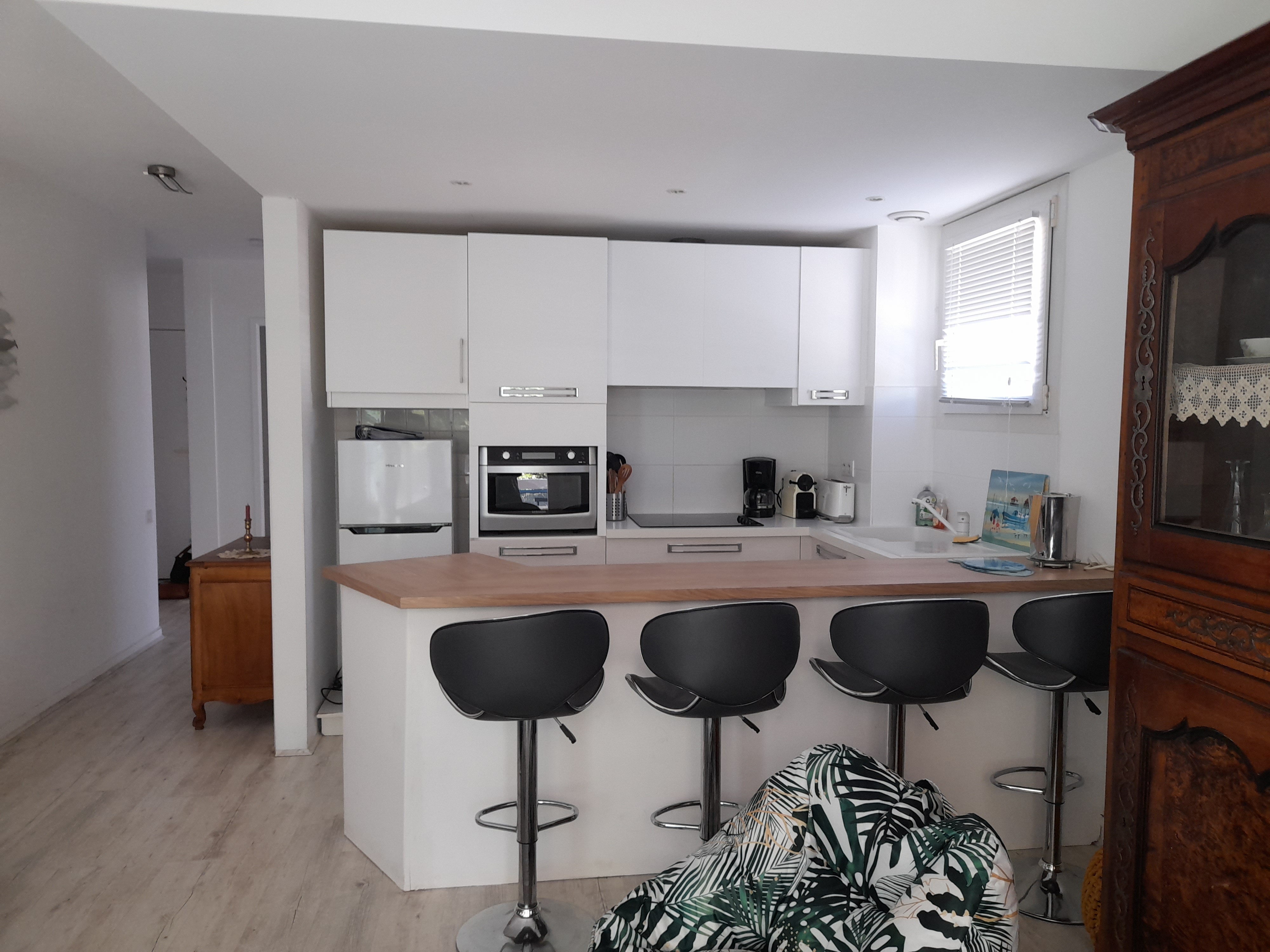 Une cuisine ouverte équipée avec plaques de cuisson, frigo/congélateur, micro-ondes combiné, Nespresso et lave-vaisselle. Le coin repas se fait sur son comptoir.