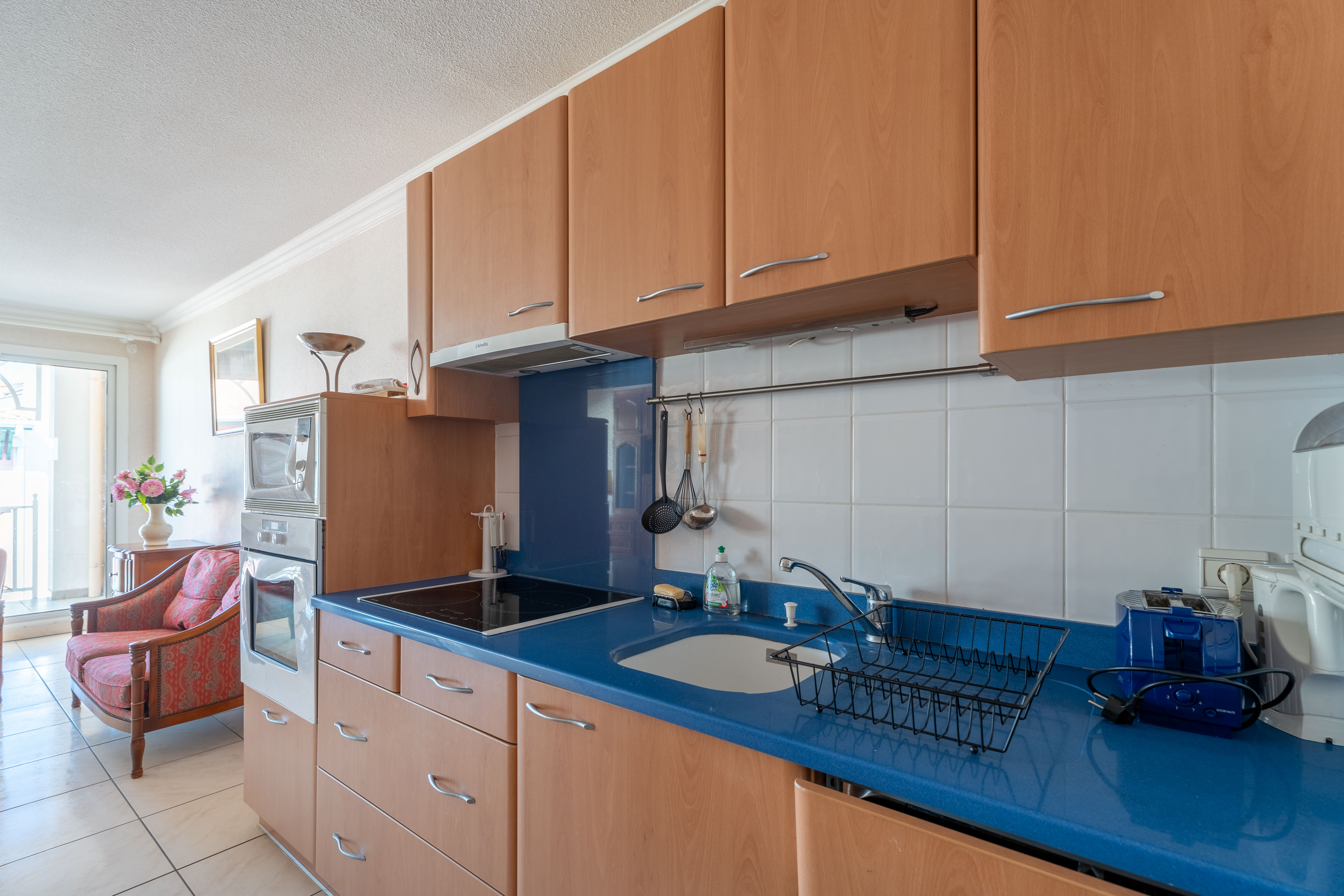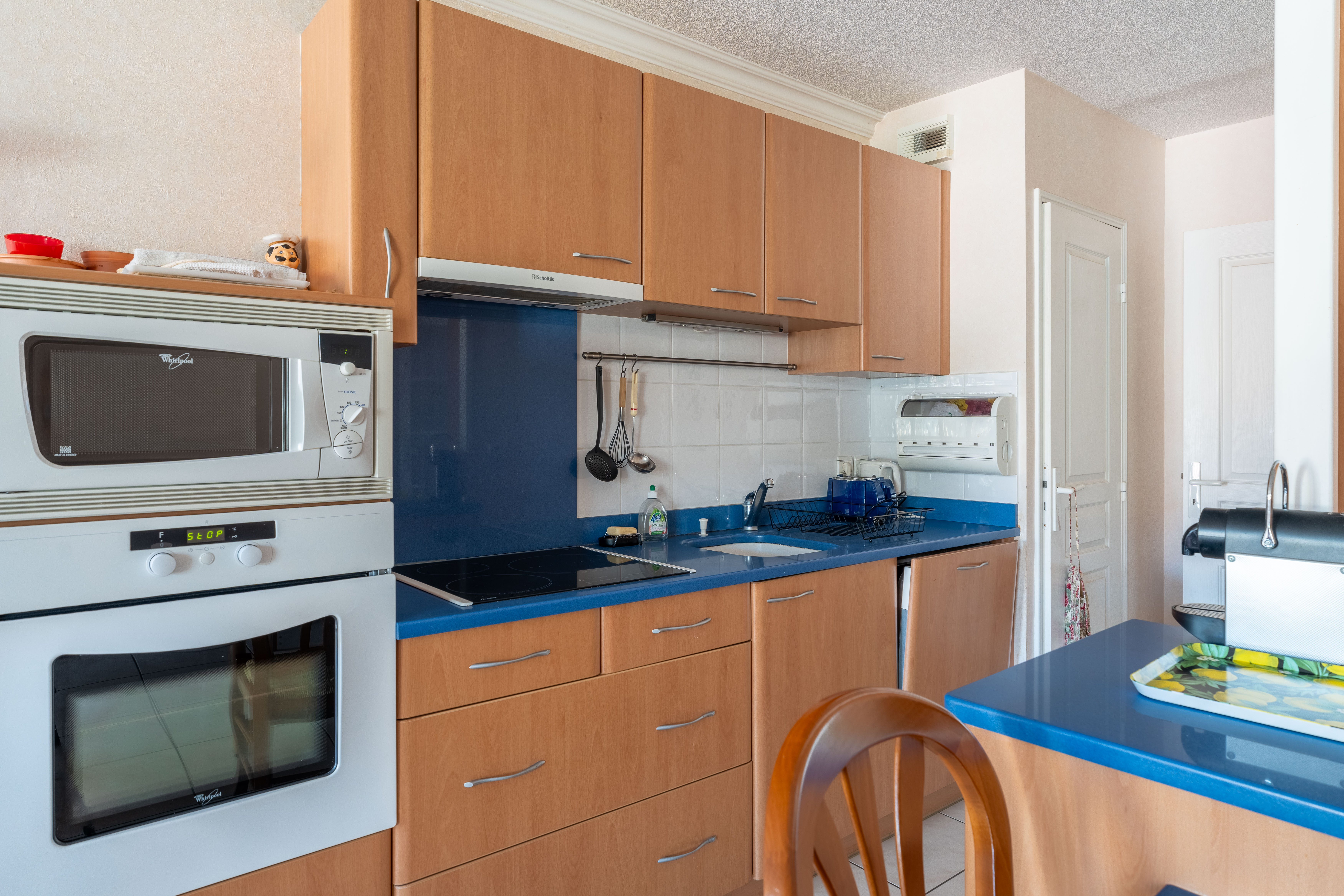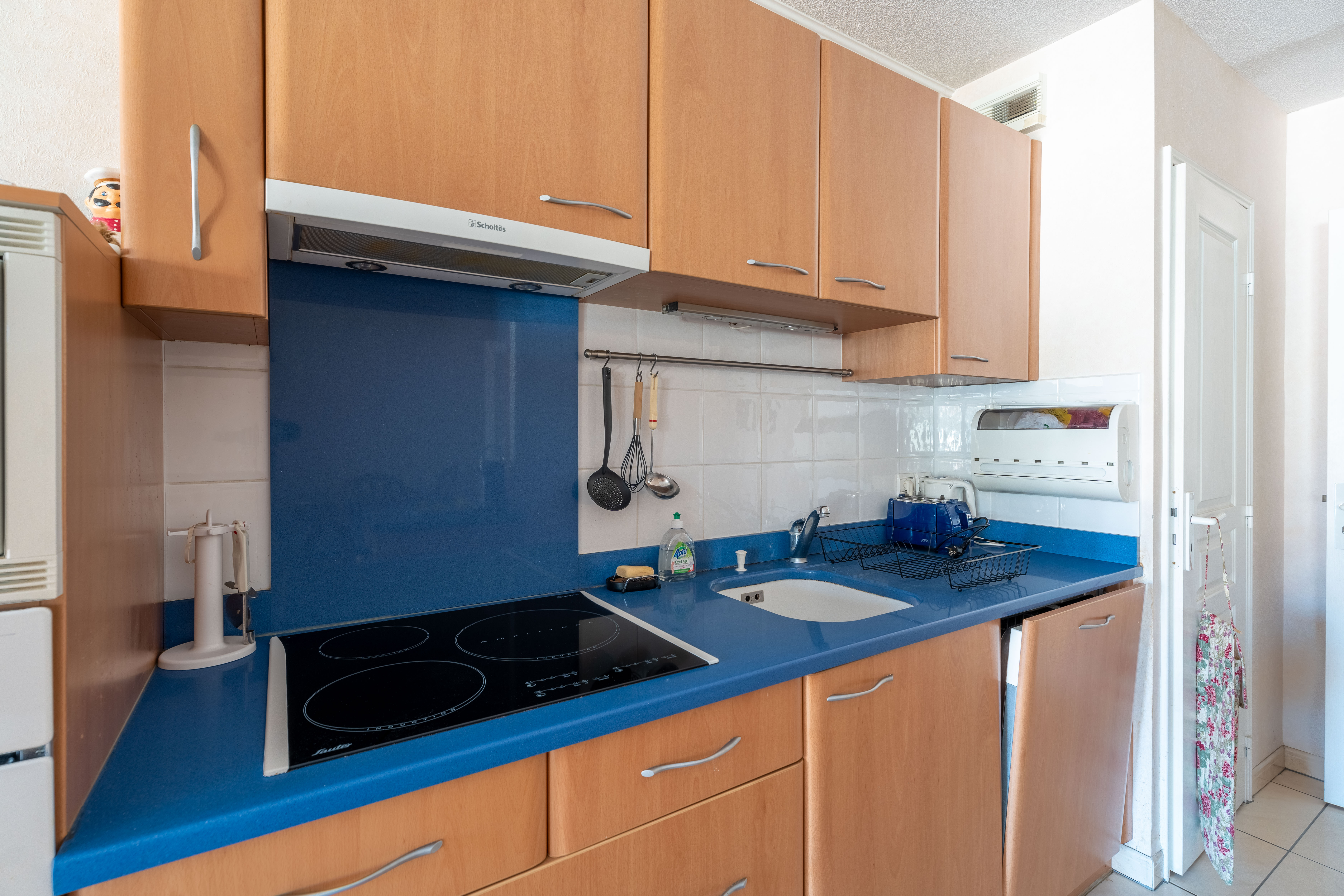 Sa cuisine ouverte toute équipée avec plaques de cuisson, four, lave-vaisselle, frigo top, micro-ondes et Nespresso.