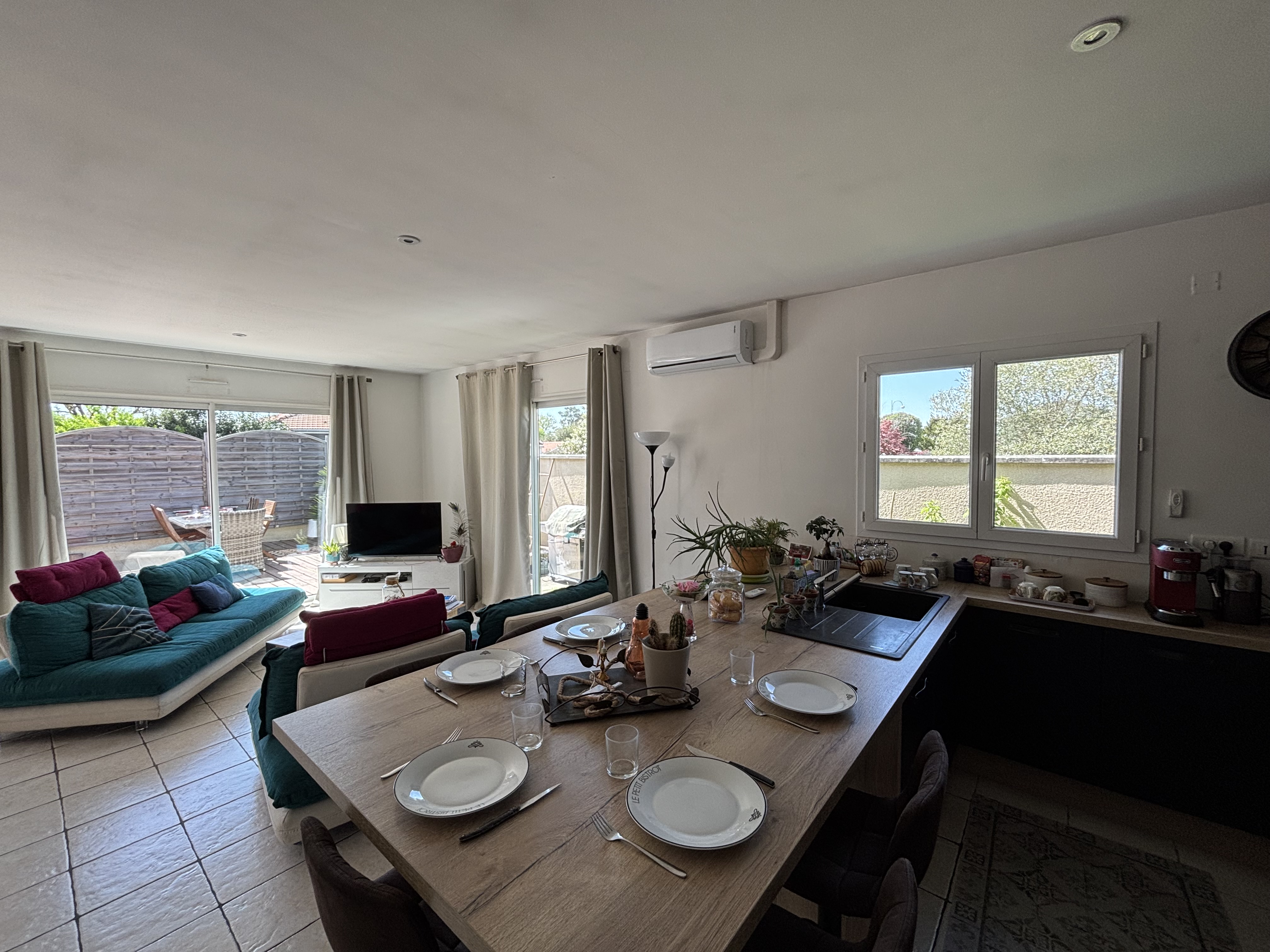 Nous vous proposons une agréable maison individuelle de 75m² avec jardin et clim réversible à Biscarrosse Bourg. Idéalement située, vous êtes à 1.4km du centre-ville, vous êtes également à 3.3km du lac de Latécoère. Vous pourrez vous rendre à vélo au lac, parfait pour faire du bateau ou du paddle en famille ou entre amis et découvrir nos jolies pistes cyclables landaises. Vous êtes également à 10km de l'océan pour prendre vos cours de surf ou vous relaxer sur la plage. La maison est composée d'une entrée amenant sur la pièce principale : un coin salon aménagé d'un canapé et d'une table basse, TV avec WIFI, plusieurs jeux de société ainsi qu'un coin salle à manger avec une grande table. La cuisine est ouverte et équipée (four, bouilloire , hotte, cafetière, lave-vaisselle…). Trois chambres, toutes composées d'un lit en 140 et de rangements ainsi que de luminaires avec ventilateurs. Une salle d'eau et un WC séparé pour plus de confort. Un cellier/buanderie avec lave-linge. Plusieurs équipements bébés sont disponibles ( lit, baignoire, chaise haute ) Vous pourrez également profiter d'une jolie terrasse avec salon de jardin, un étendage ainsi qu'un barbecue et d'un jardin paysagé. Possibilité de garer votre voiture dans l'enceinte de la propriété. Vous vous garer en arrivant et vous pouvez si vous le souhaitez partir à vélo pour faire le marché, boire un café en terrasse, pour les plus sportifs pédaler jusqu’à l’océan pour profiter du coucher de soleil et manger dans nos restaurants pieds dans le sable. Des vacances ensoleillé n'attendent que vous !