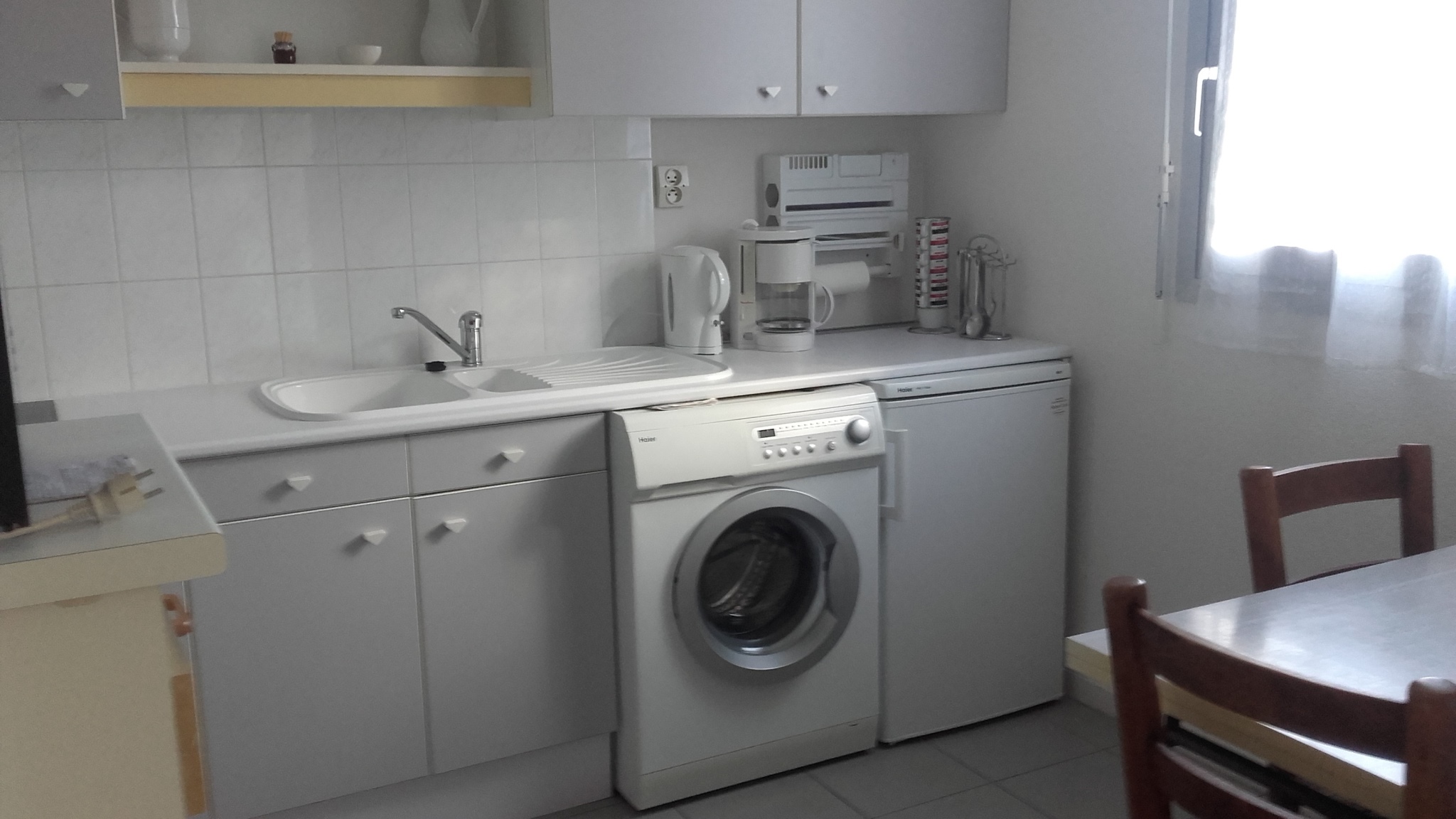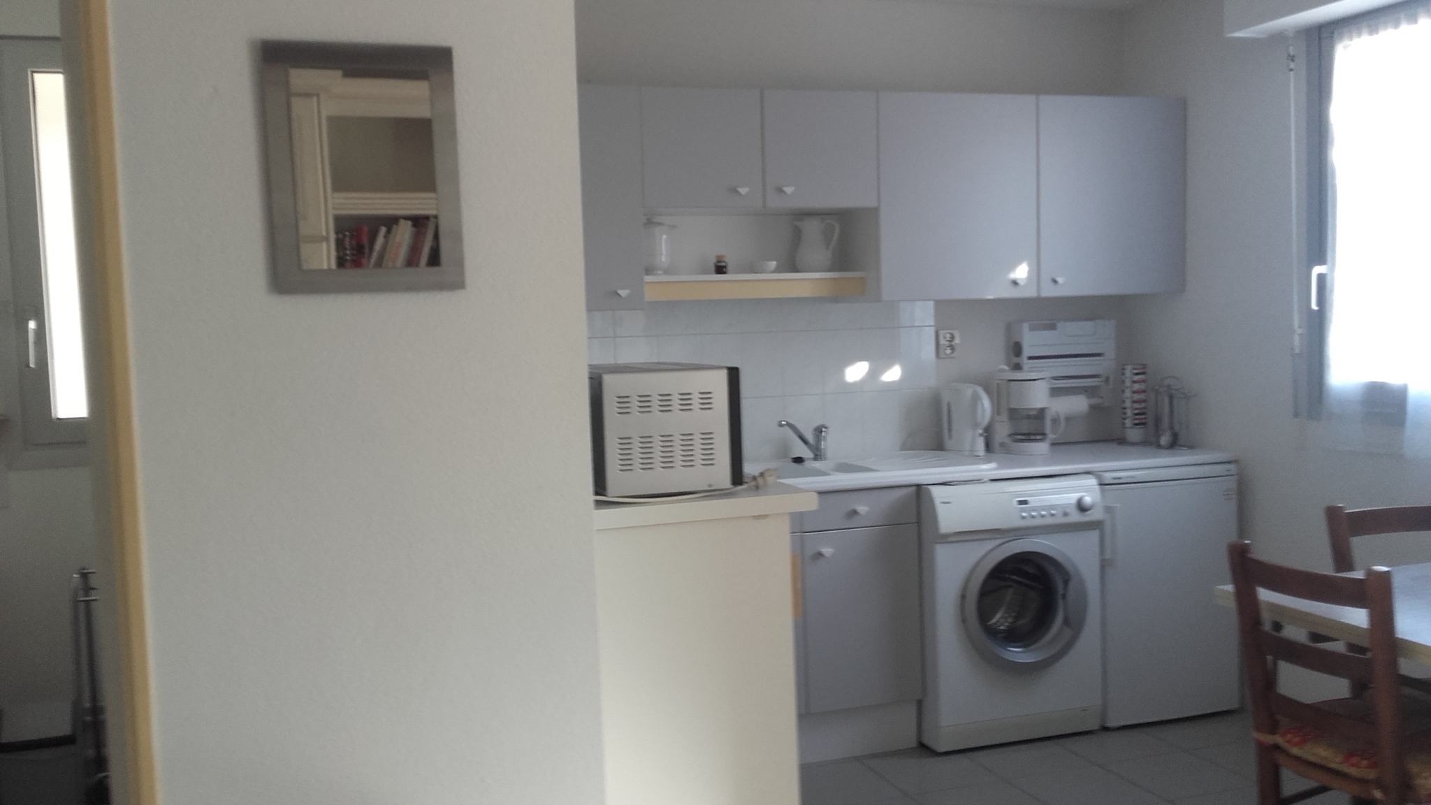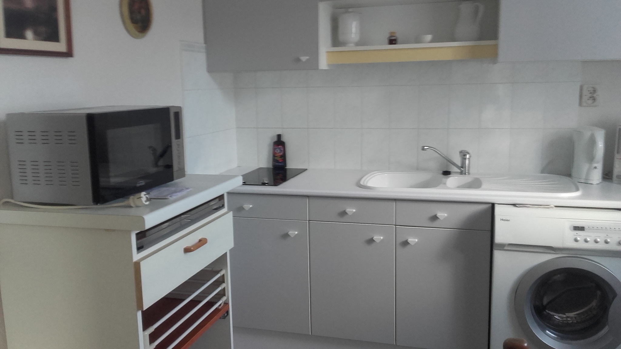 Son coin cuisine toute équipée avec frigo Top, plaques vitro céramiques, micro-ondes/grill et lave linge.