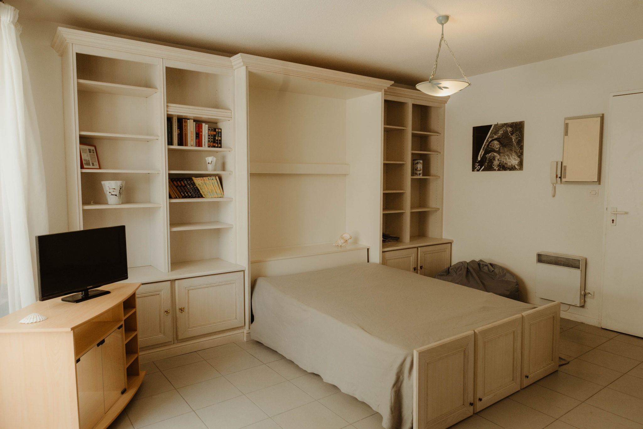 Sa pièce principale avec un lit placard en 140 qui vous offre deux couchages, que l’on peut rabattre la journée (très facilement) pour bénéficier de tout l'espace, TV, (pas de WIFI).
