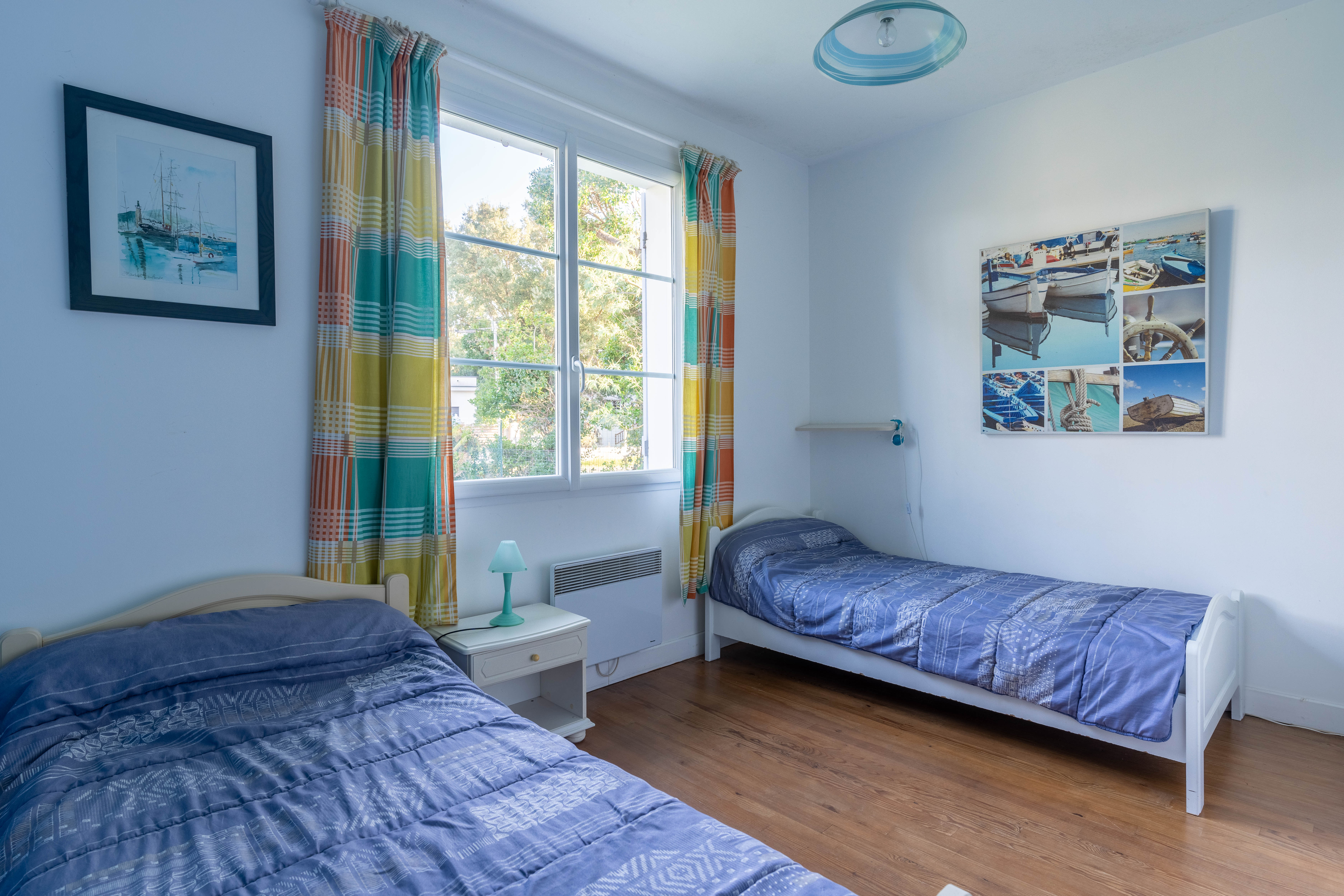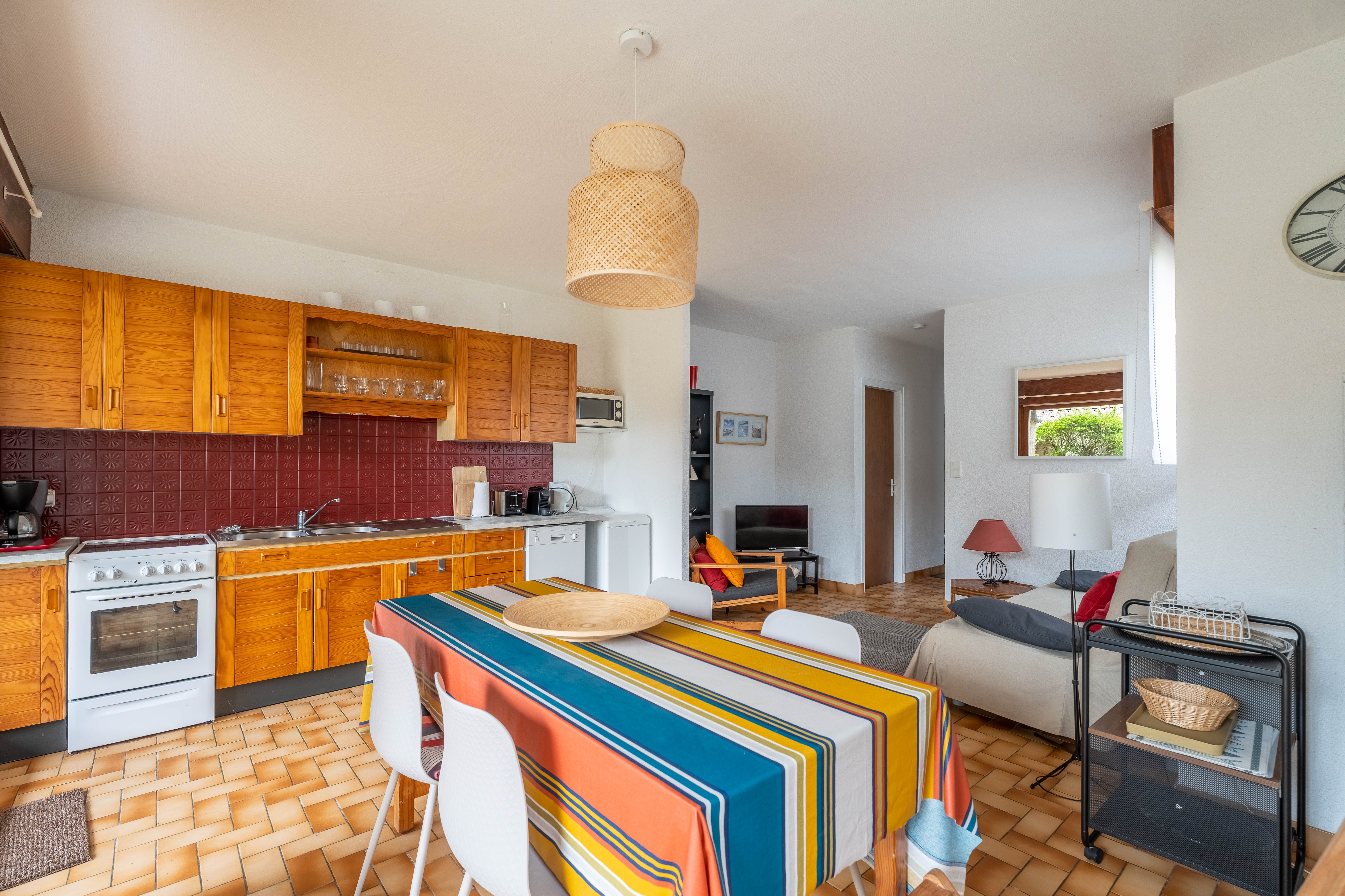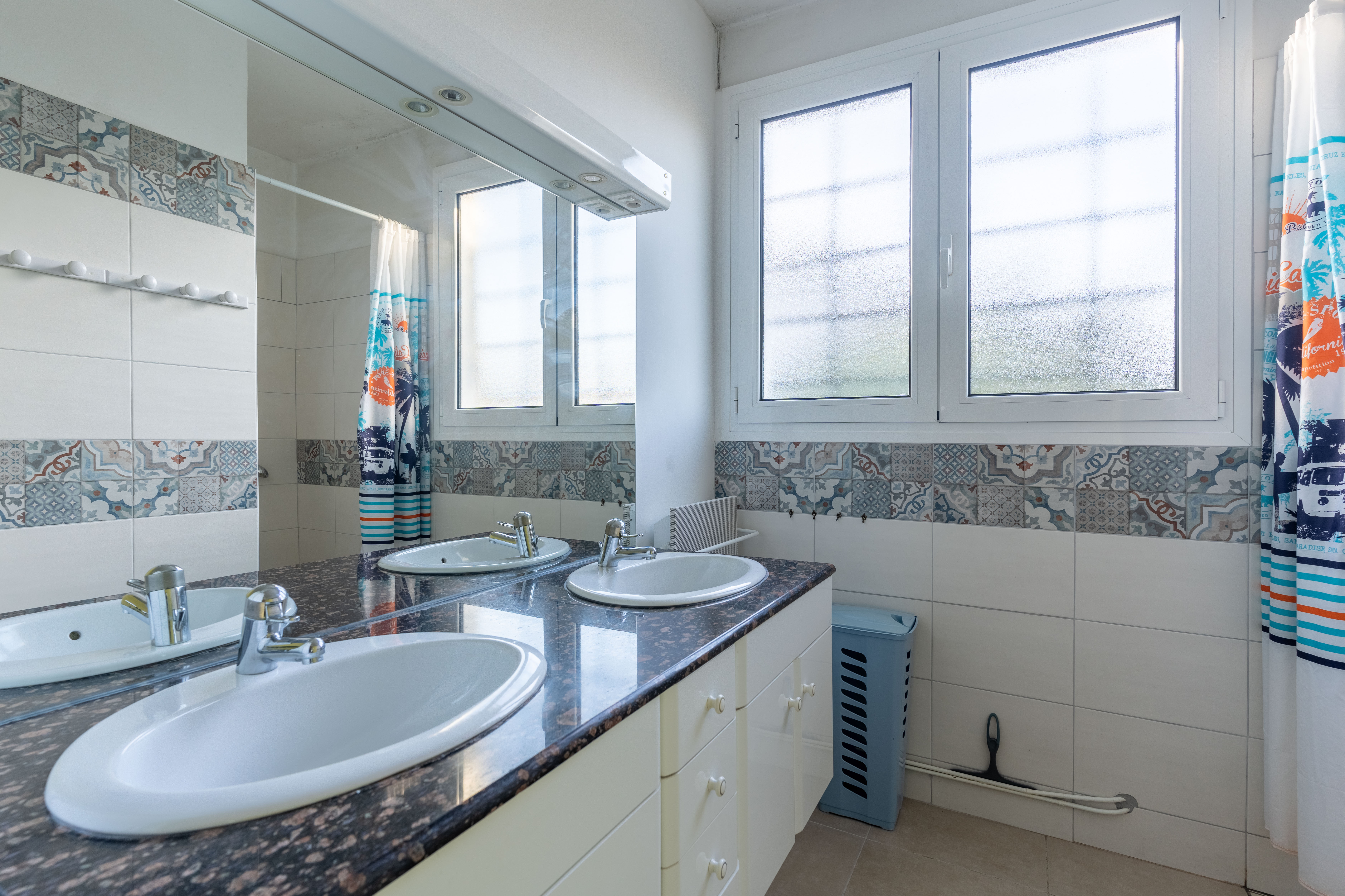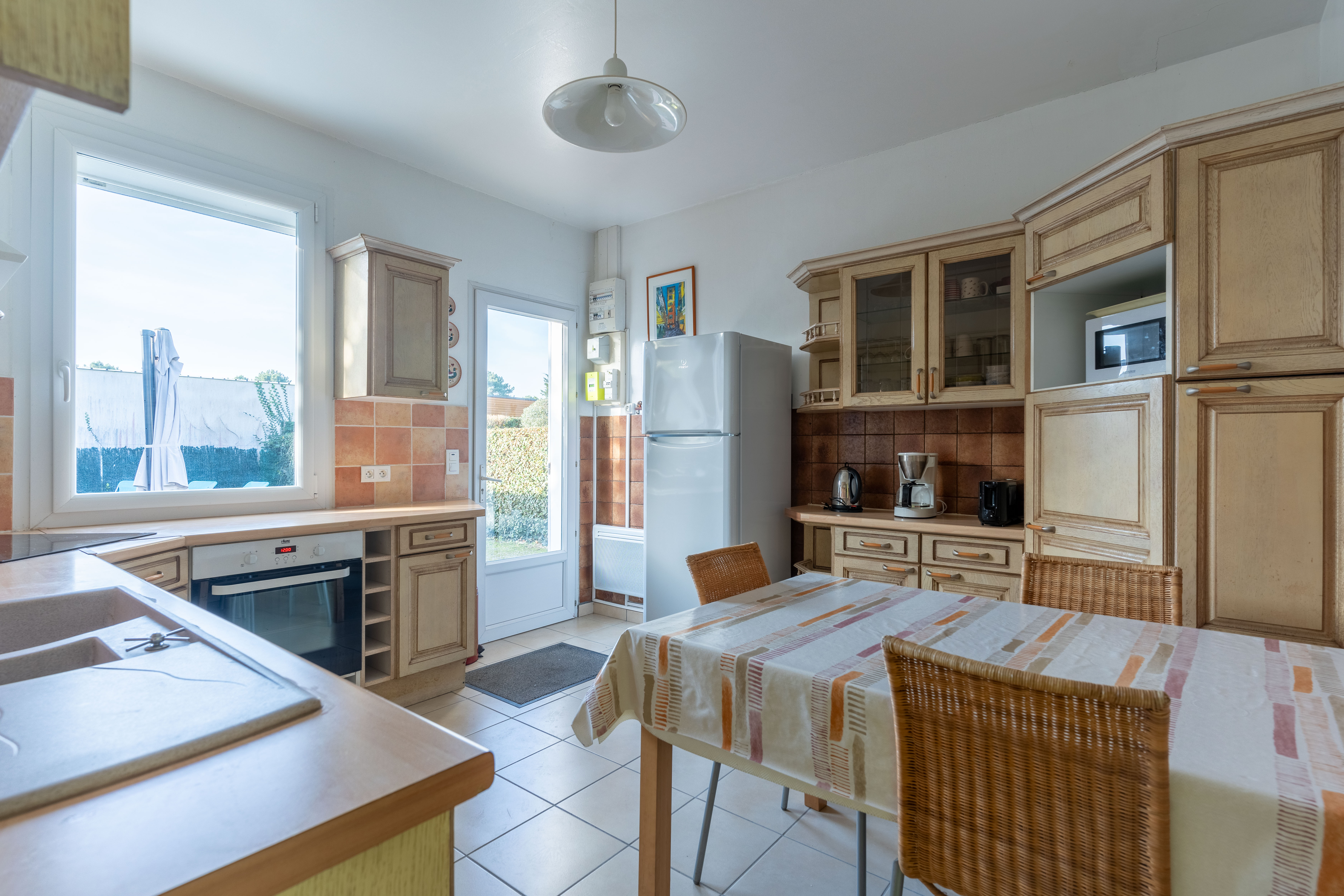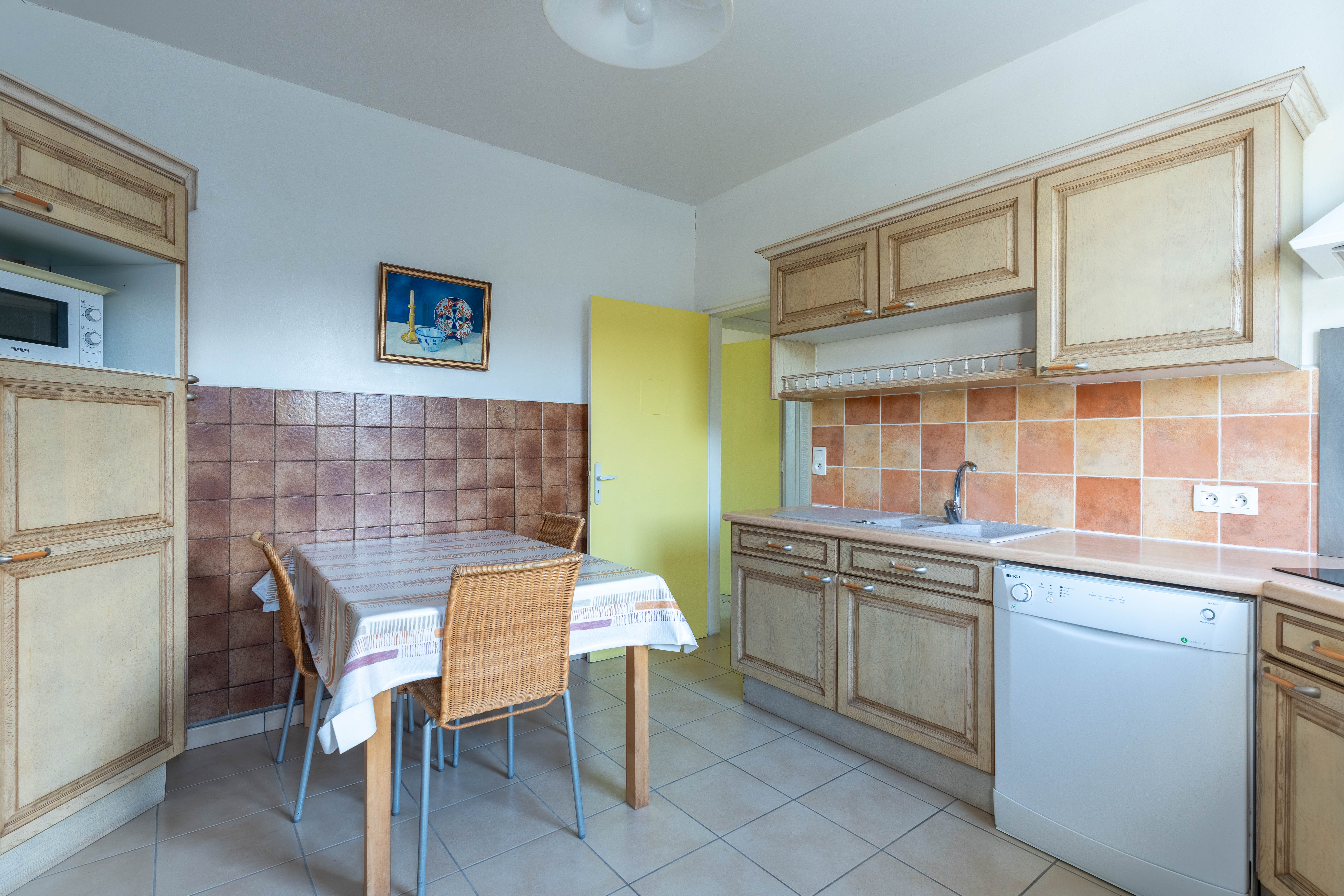 Elle dispose de trois chambres, parfaites pour accueillir jusqu’à six personnes. Vous y trouverez une première chambre avec un lit double de 140 cm, une seconde avec un lit double de 160 cm, et une troisième équipée de deux lits simples de 90 cm. Le salon, spacieux et lumineux, est aménagé avec un grand canapé confortable et une télévision à écran plat, créant ainsi un espace de détente idéal après une journée bien remplie. La cuisine, entièrement équipée, vous permettra de préparer de délicieux repas. Elle comprend un réfrigérateur avec congélateur, un four, un micro-ondes, une plaque à induction, un lave-vaisselle, ainsi que deux cafetières, une bouilloire et un grille-pain. La salle d'eau, pratique, dispose de deux vasques, et les toilettes sont séparées pour plus de commodité.