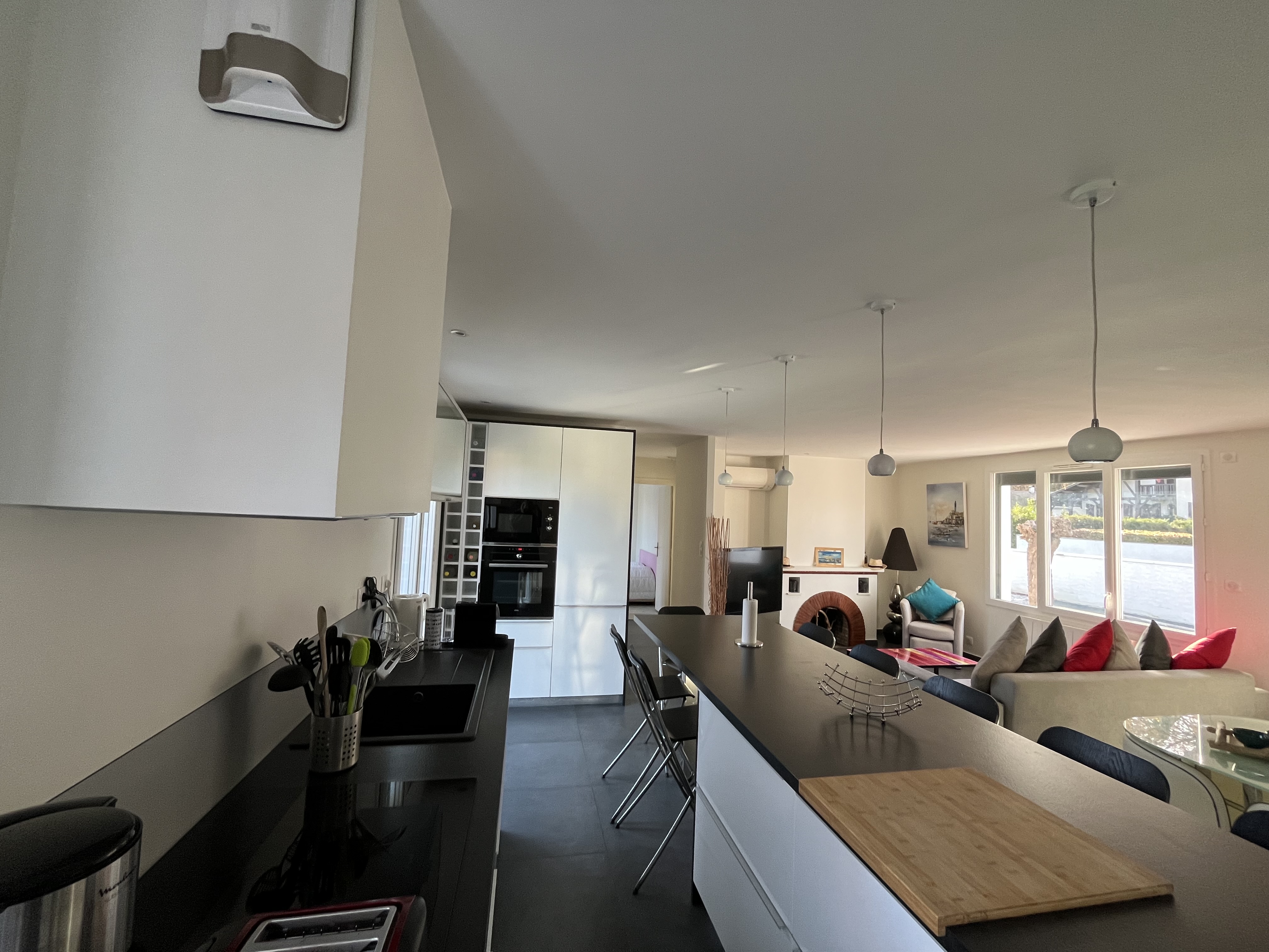 Sa cuisine ouverte toute équipée avec plaques de cuisson, hotte, four, lave-vaisselle, frigo/congélateur, micro-ondes et cafetière Nespresso.