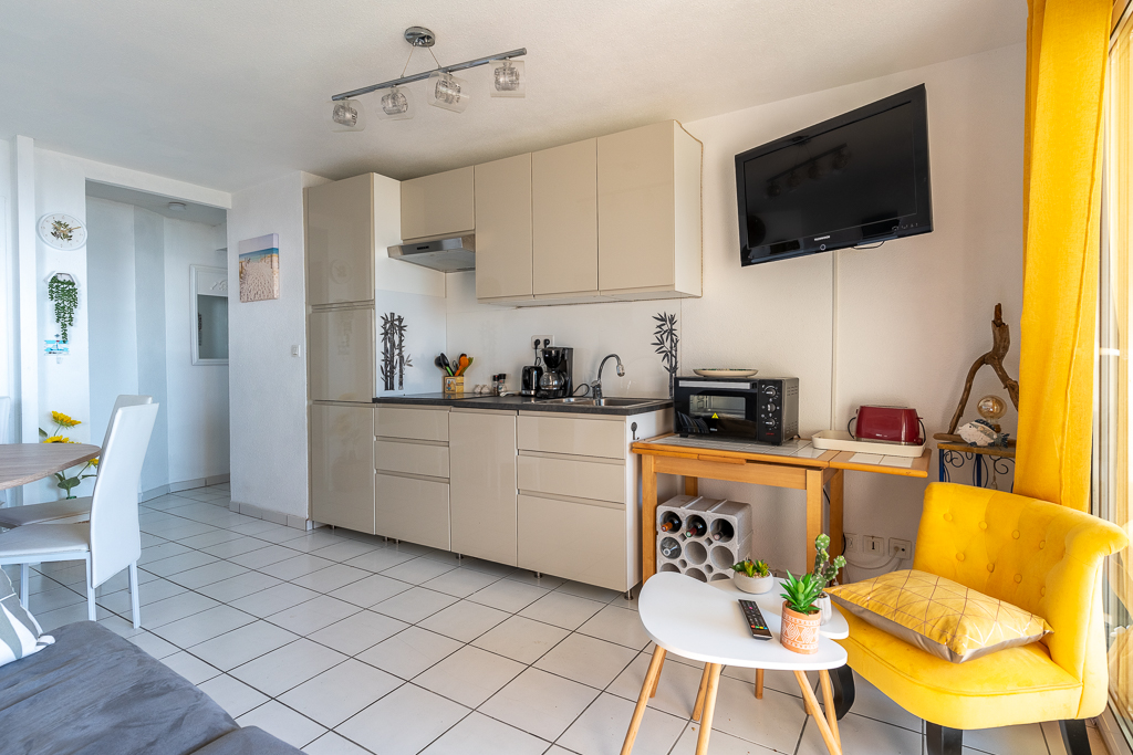 La pièce de vie, lumineuse et spacieuse, comprend un séjour avec canapé et TV, ainsi qu’une cuisine aménagée et entièrement équipée, comprenant un réfrigérateur/freezer, un four électrique, une plaque vitrocéramique, un micro-ondes, un lave vaisselle, une cafetière et un grille-pain. L'appartement offre également une chambre avec un lit en 140, une seconde chambre équipée d’un lit en 160 et d’une magnifique vue sur l’océan, idéale pour des réveils en douceur. Vous trouverez également une salle d'eau moderne et un WC séparé avec lave-linge, pour plus de praticité.