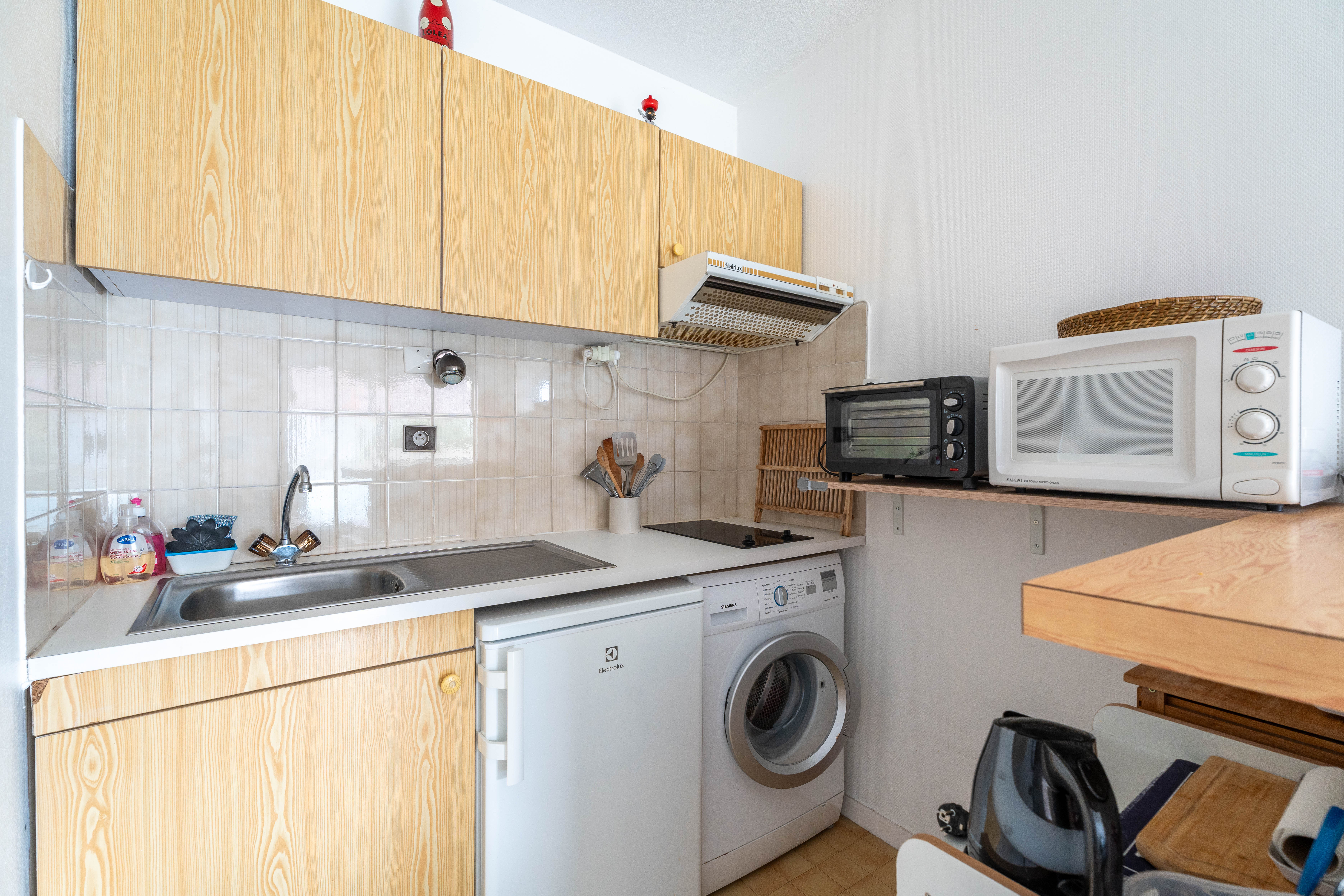 Sa petite cuisine ouverte toute équipée avec plaques de cuisson, mini four, micro-ondes, frigo TOP et lave-linge. Un WC séparé.