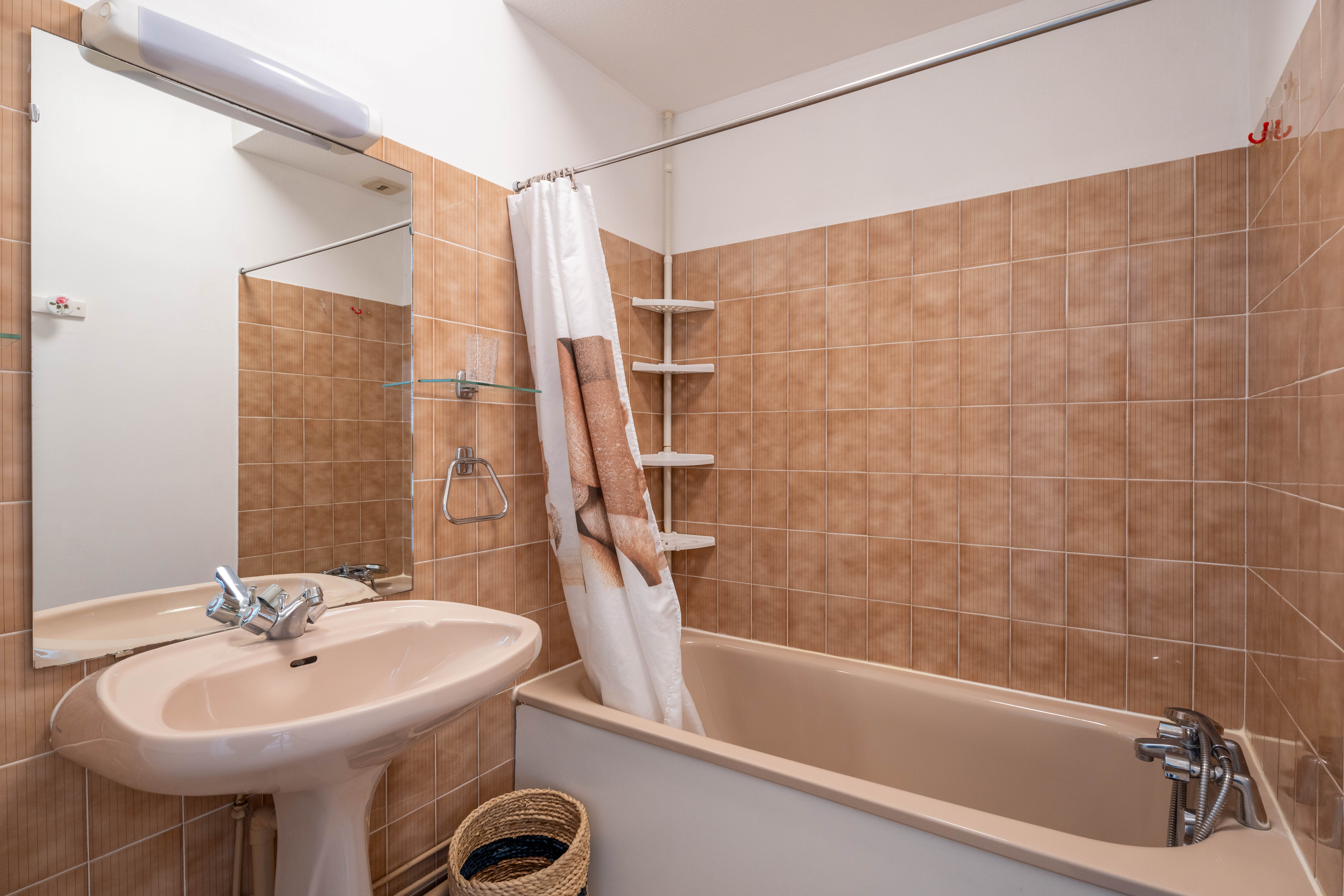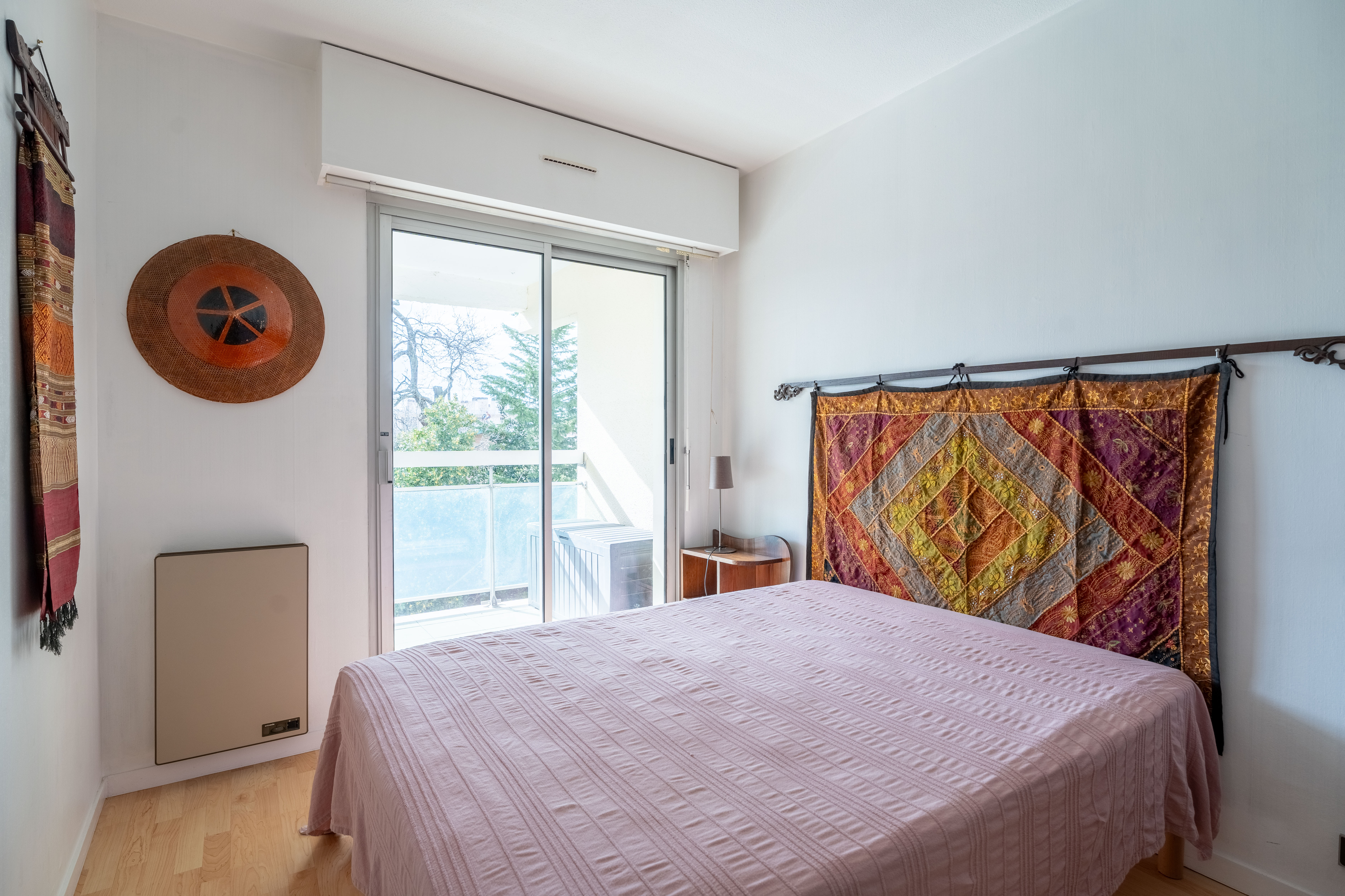 Une chambre avec un lit en 140 pour deux personnes, donnant également sur le balcon. Une salle de bain. Et un placard de rangement dans le couloir.