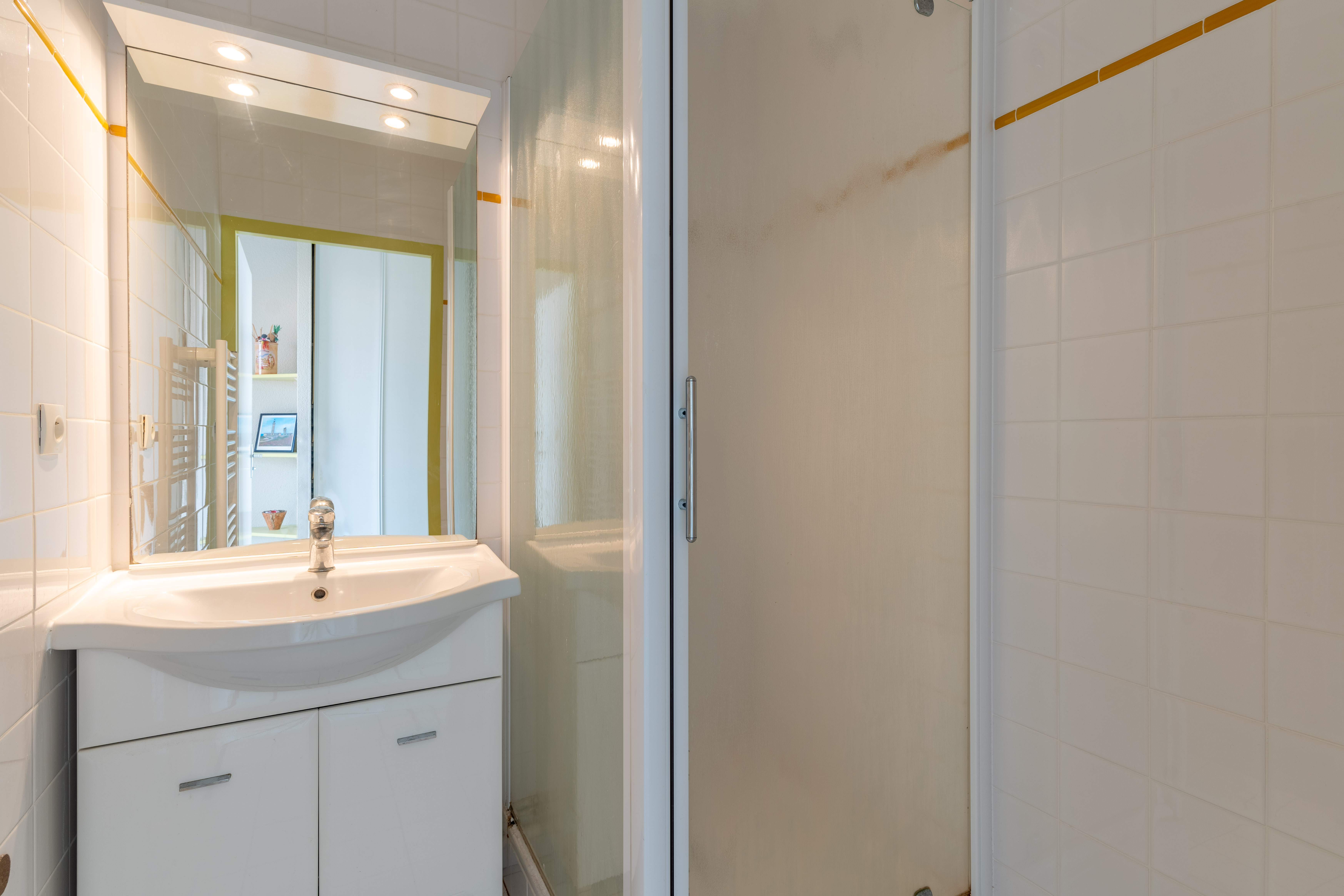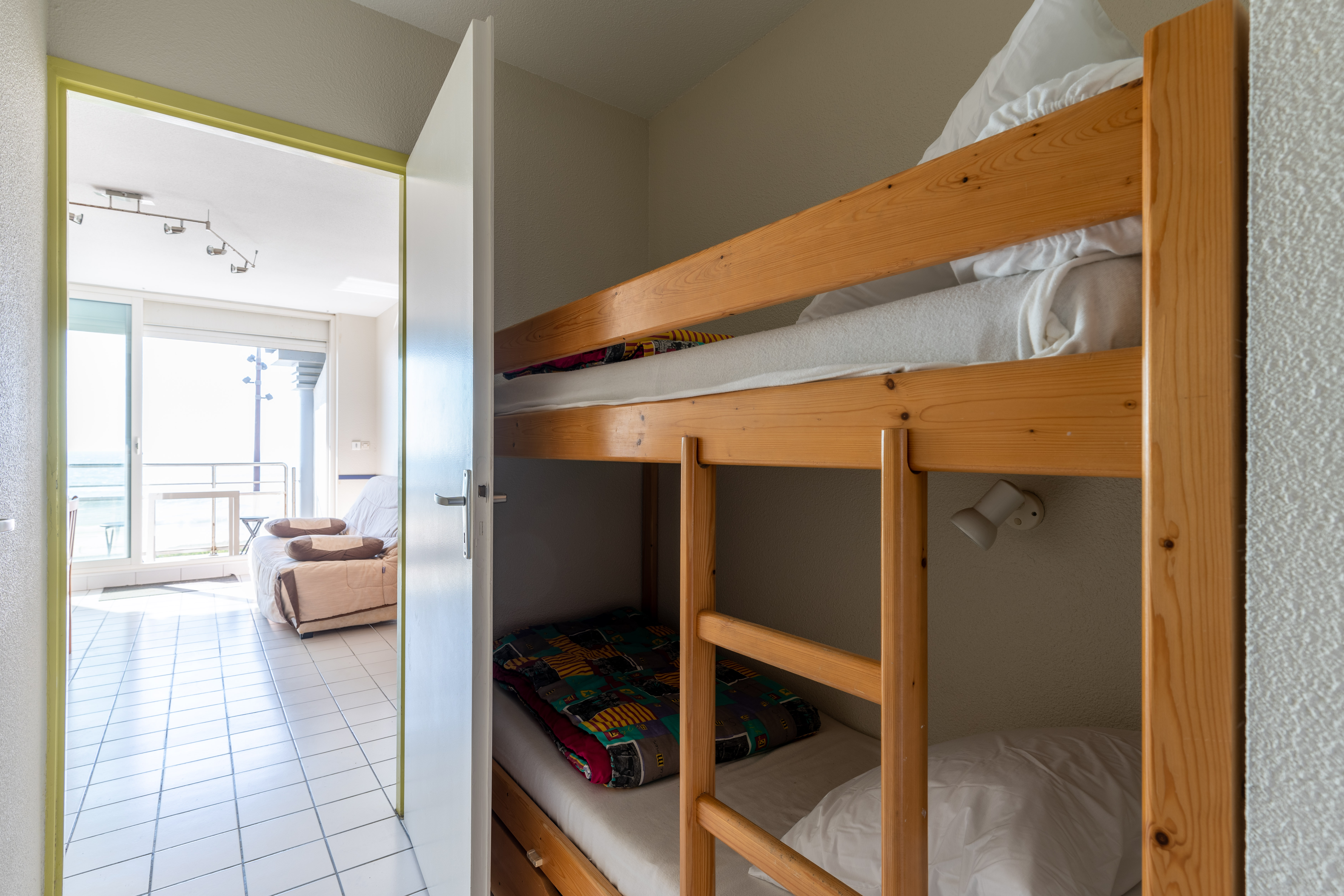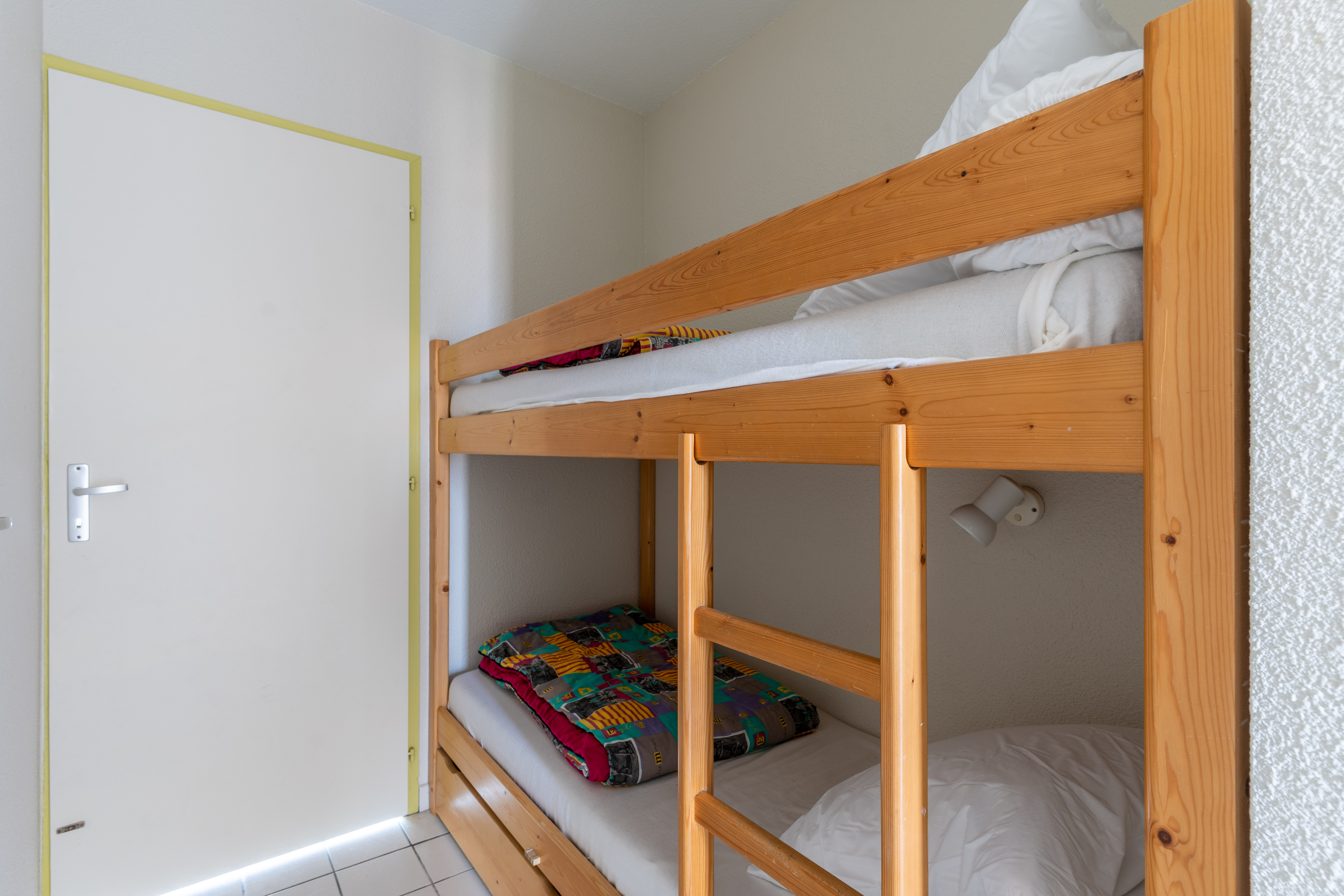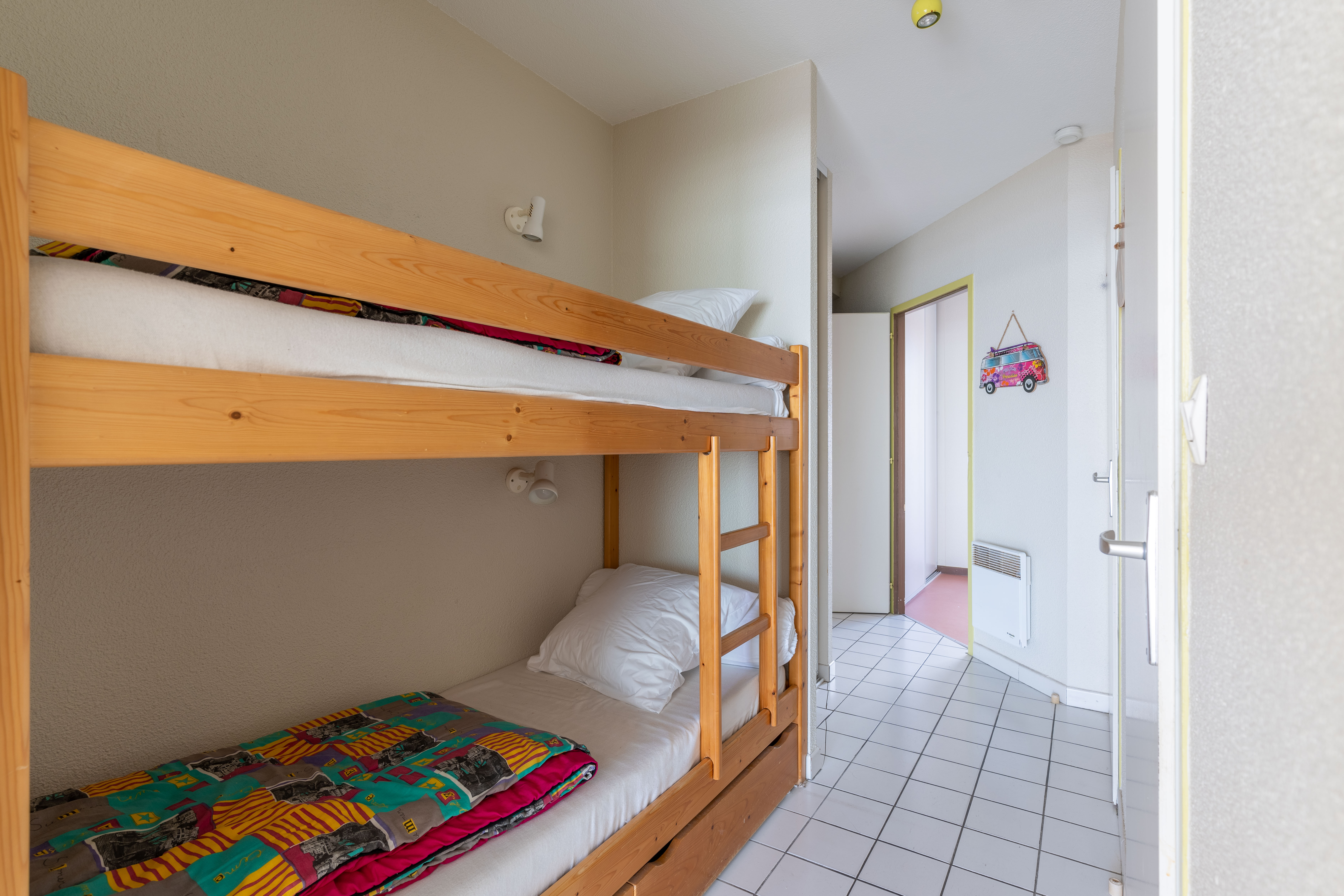 Au troisième étage, cet appartement de 40 m² peut accueillir jusqu’à 6 personnes, parfait pour un séjour en famille ou entre amis. Il comprend une entrée avec un lit superposé (90 cm), une chambre indépendante avec un lit double (140 cm), une salle d’eau et un WC séparé.