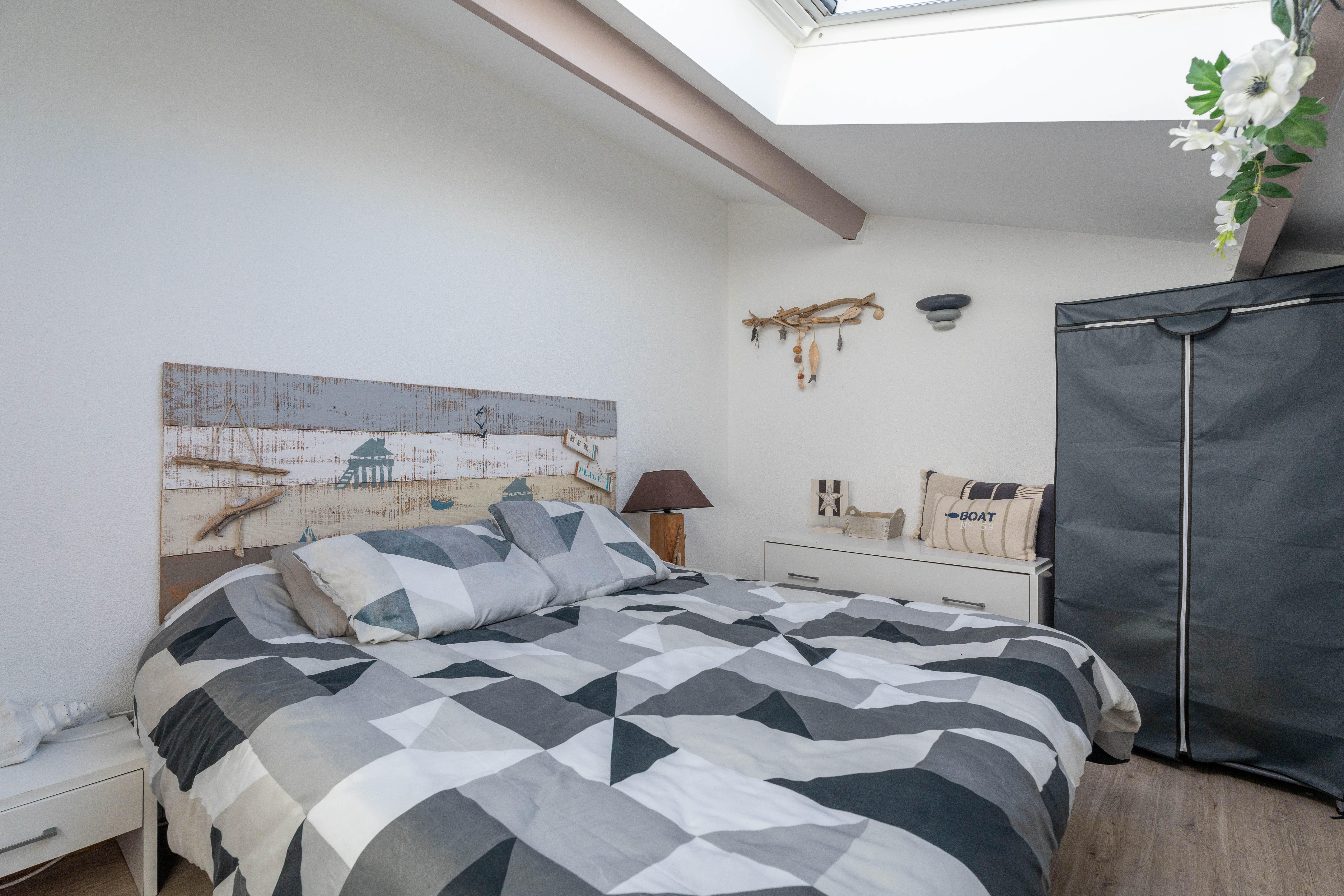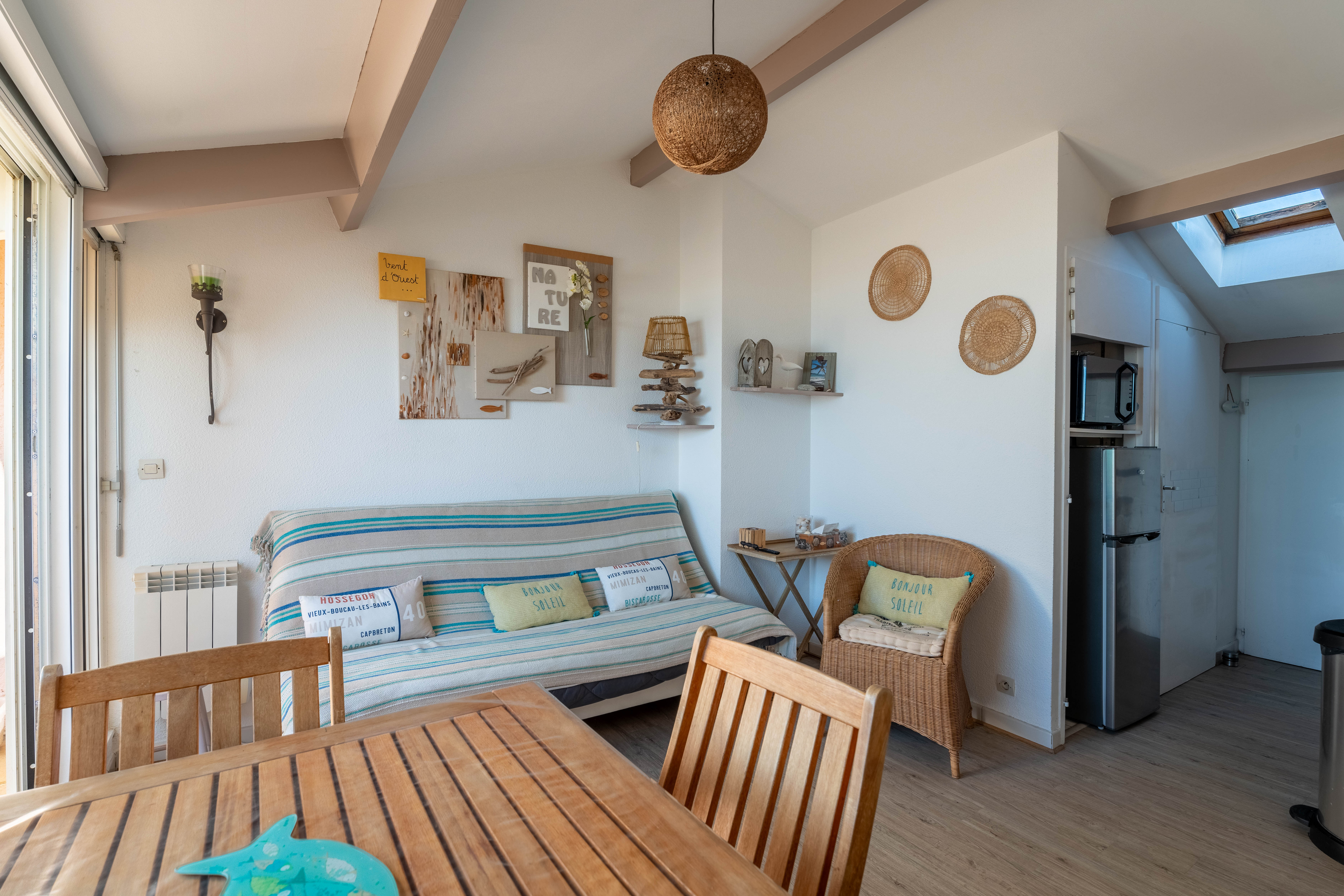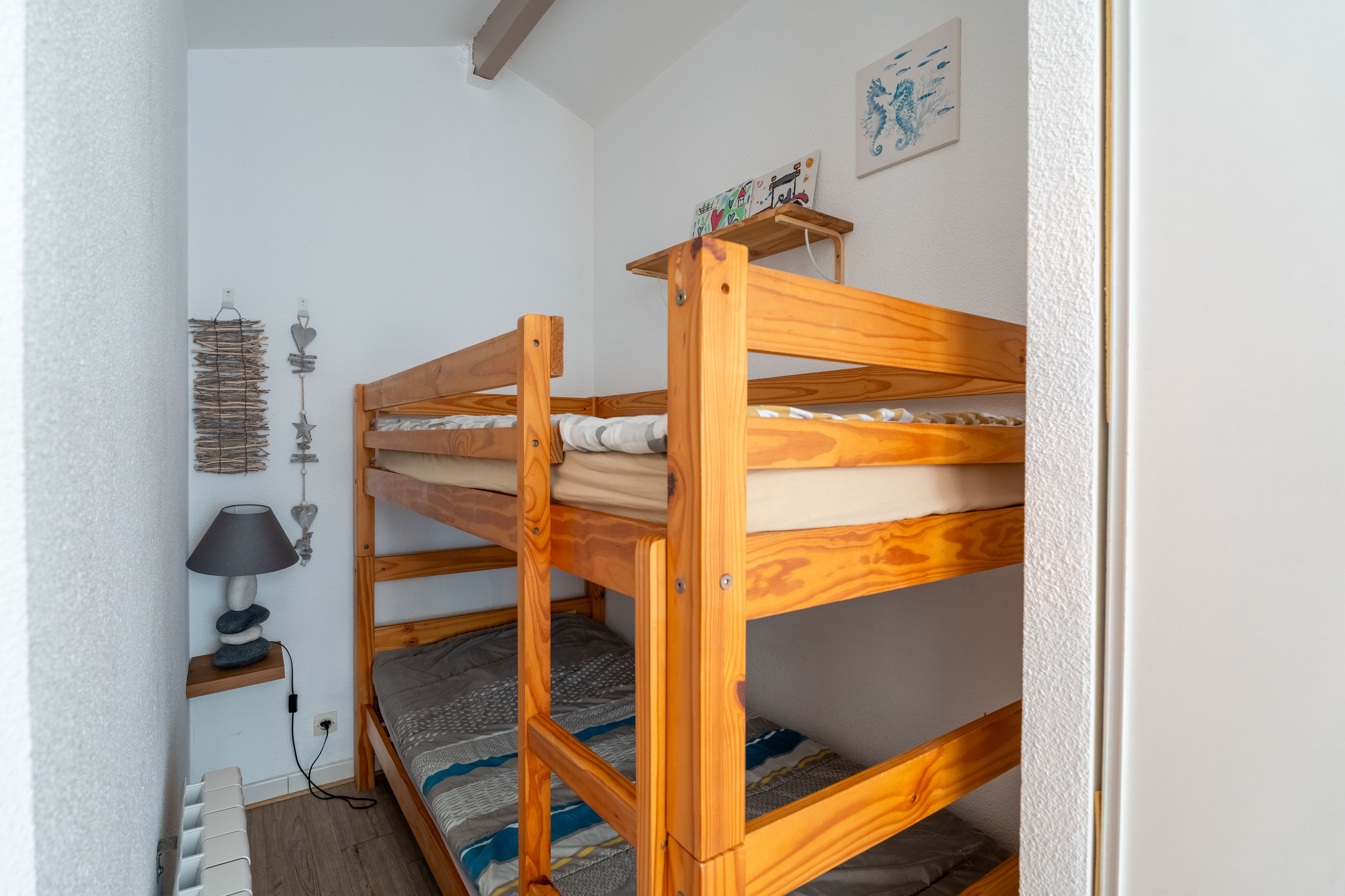 L’intérieur de l’appartement est confortable et bien agencé. Il se compose d’une entrée avec un lit superposé de 90 cm, d’une chambre avec un lit double de 160 cm, et d’un coin nuit équipé d’un canapé convertible (clic-clac).
