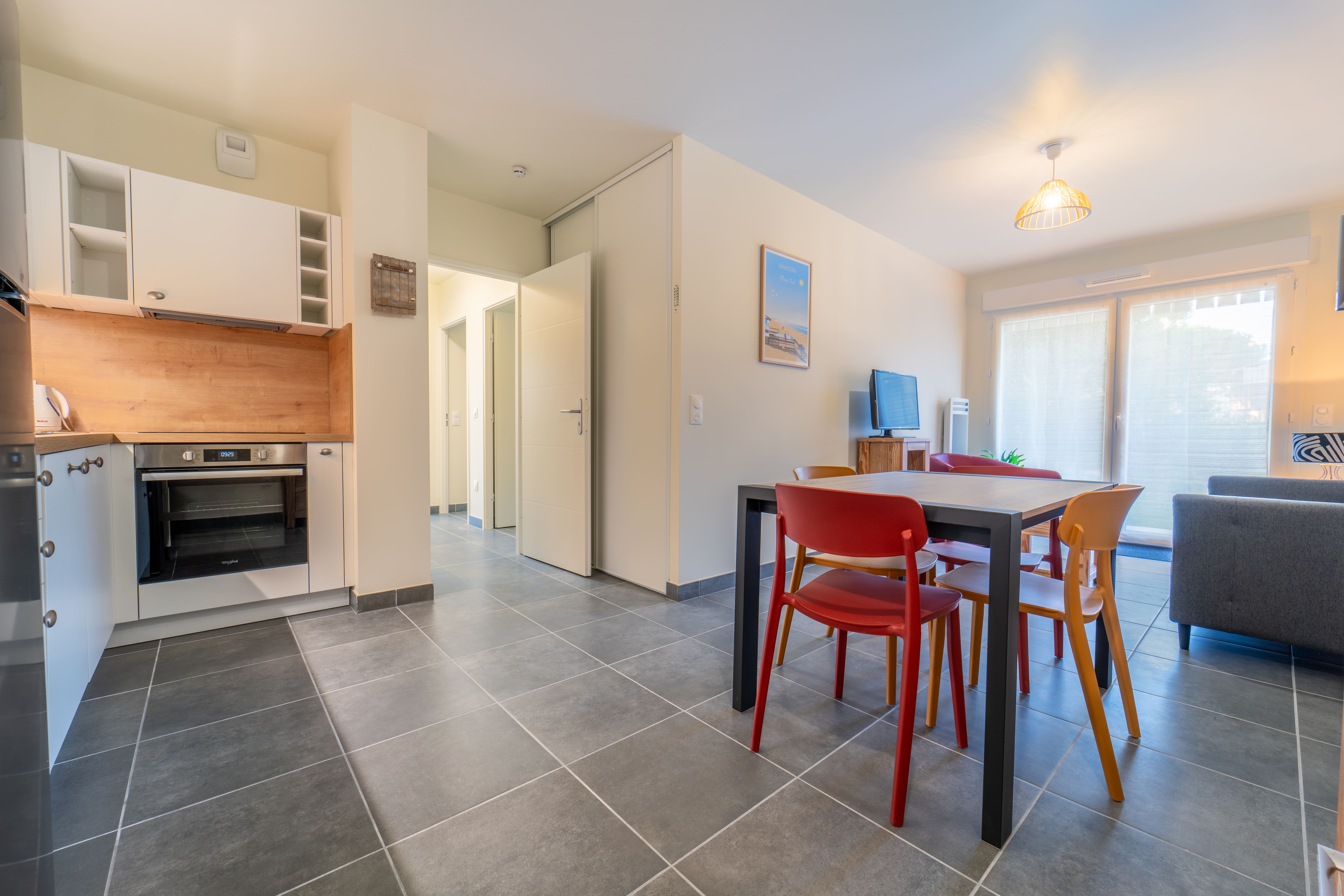 Le séjour, à la fois lumineux et accueillant, dispose d’un canapé et d’une télévision à écran plat, parfait pour vos moments de détente. La cuisine est équipée, avec un réfrigérateur/congélateur, une plaque vitrocéramique, un micro-ondes et un lave-vaisselle, pour vous offrir tout le nécessaire à la préparation de vos repas dans les meilleures conditions.
