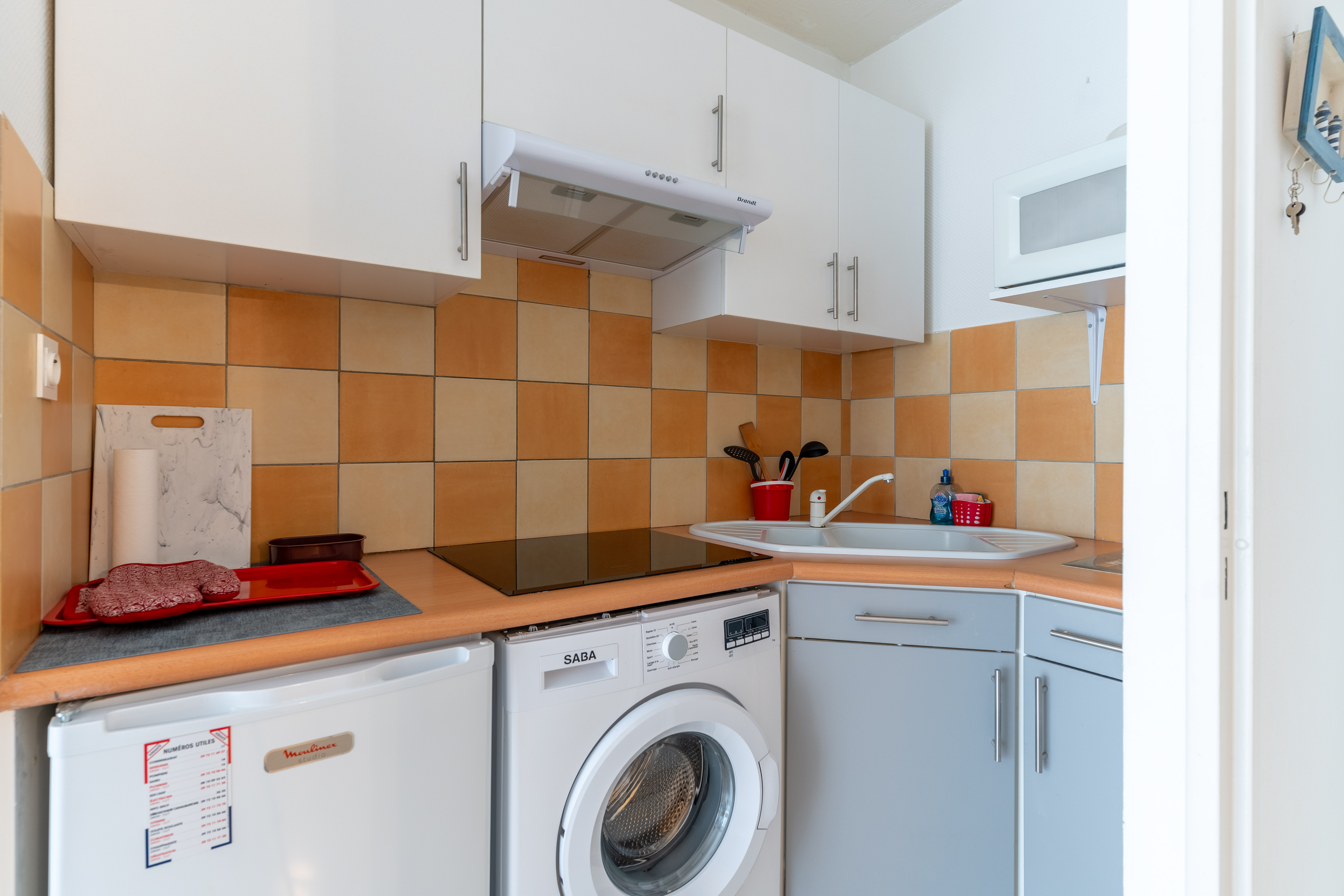Une petite cuisine équipée avec plaques de cuisson, frigo TOP, micro ondes, Nespresso et lave linge.