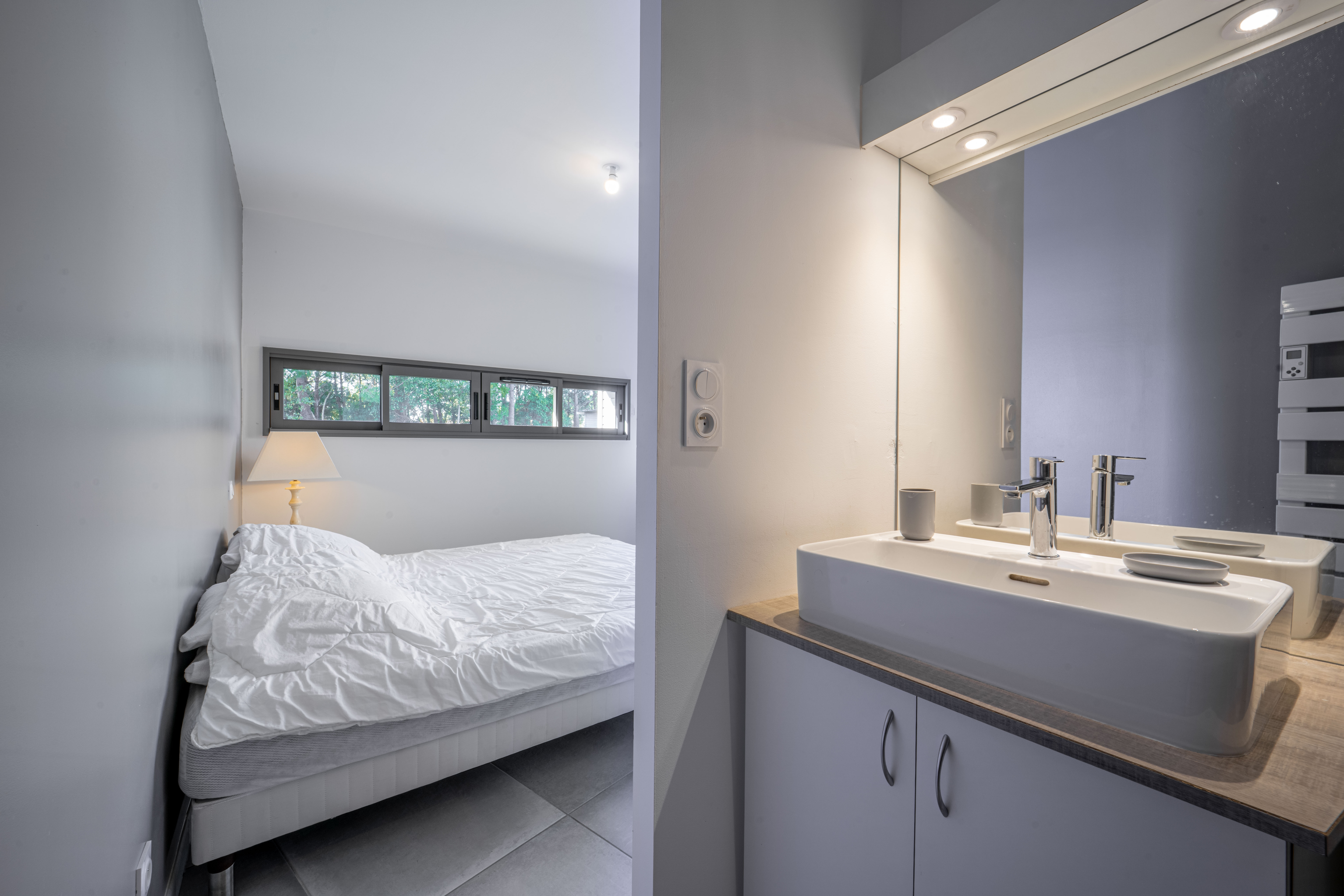 – La première chambre, avec deux lits en 90 cm jumelables, donne directement sur la terrasse et la piscine, et comprend sa salle d’eau avec WC.