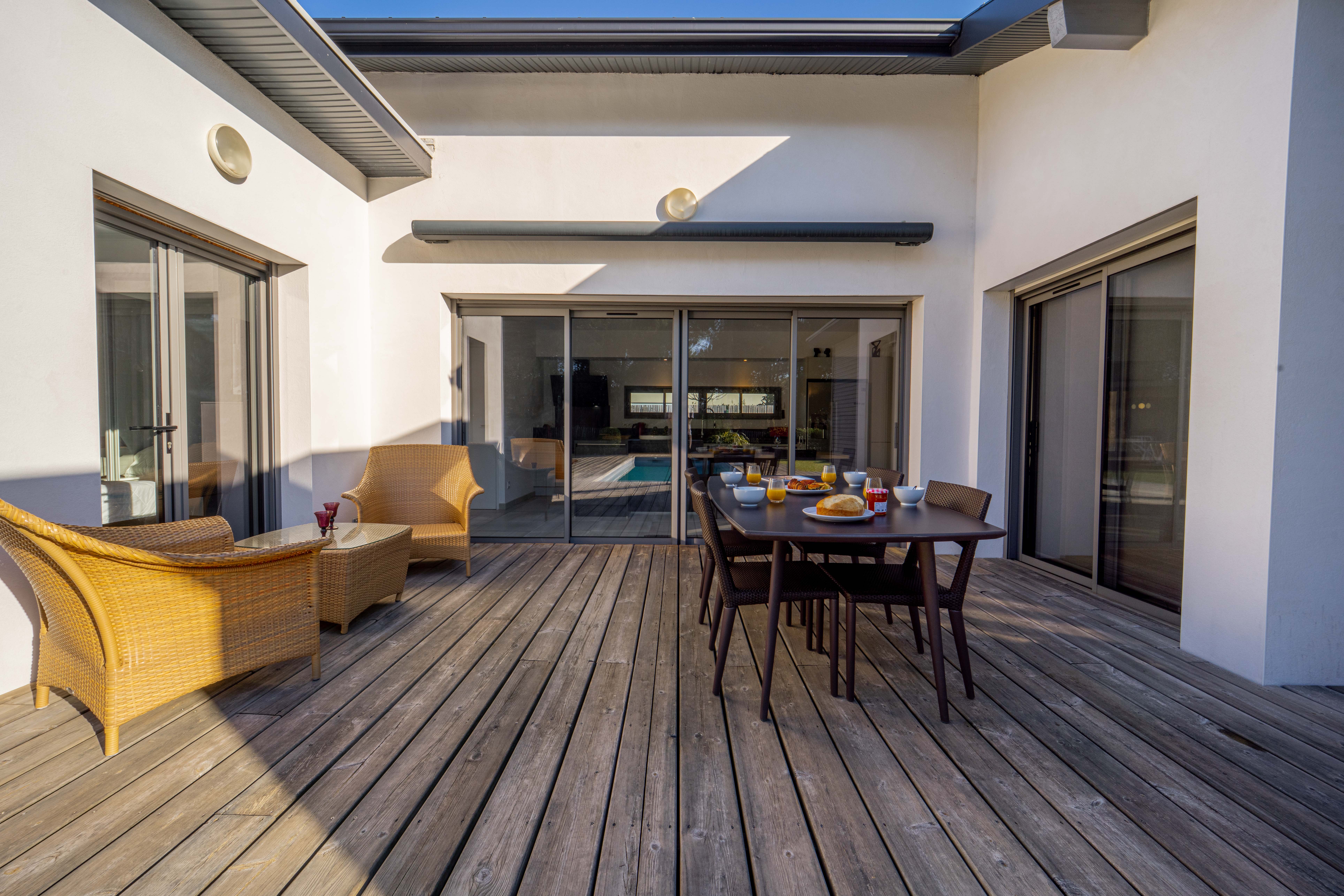 Vous disposerez également d’une grande terrasse équipée d’un salon de jardin, d’une table à manger, d’un store banne et d’une plancha pour des repas conviviaux en plein air.