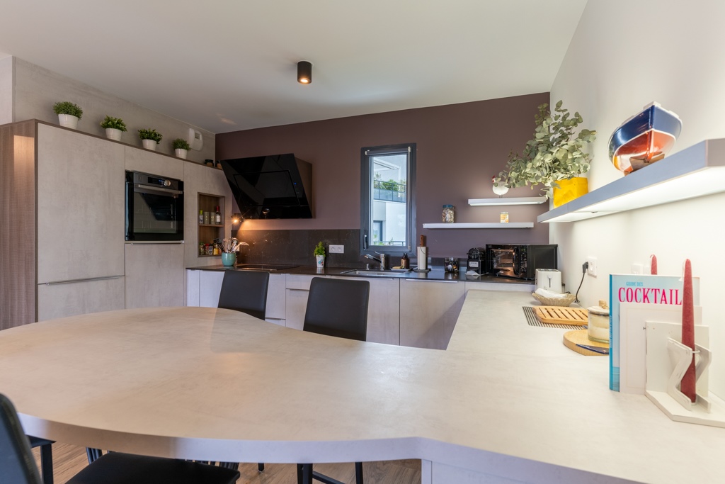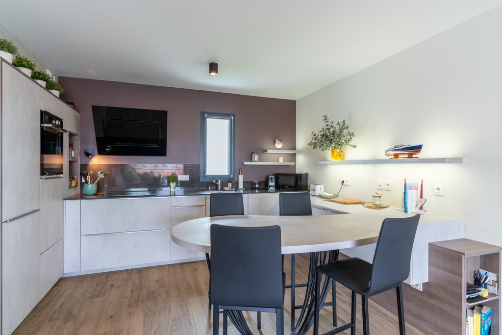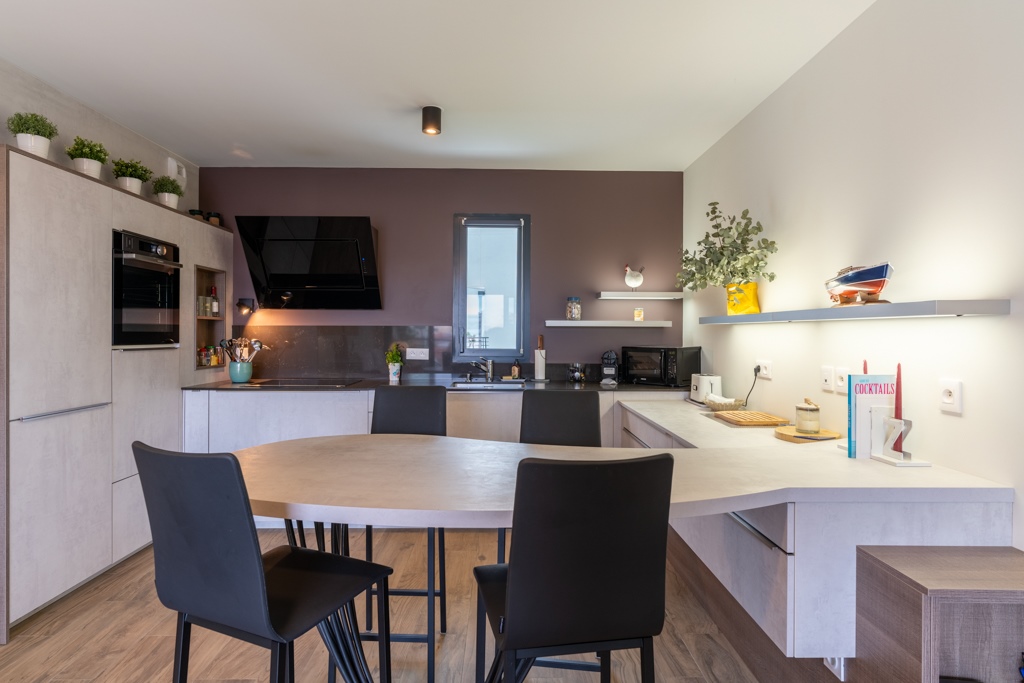 Une grande cuisine ouverte toute équipée avec plaques de cuisson, four, lave-vaisselle, frigo/congélateur, micro-ondes et Nespresso.