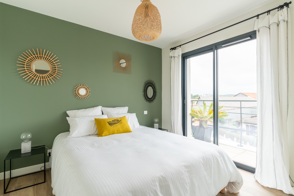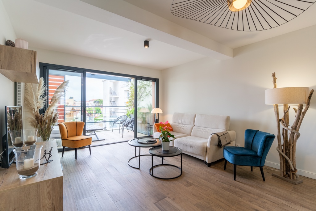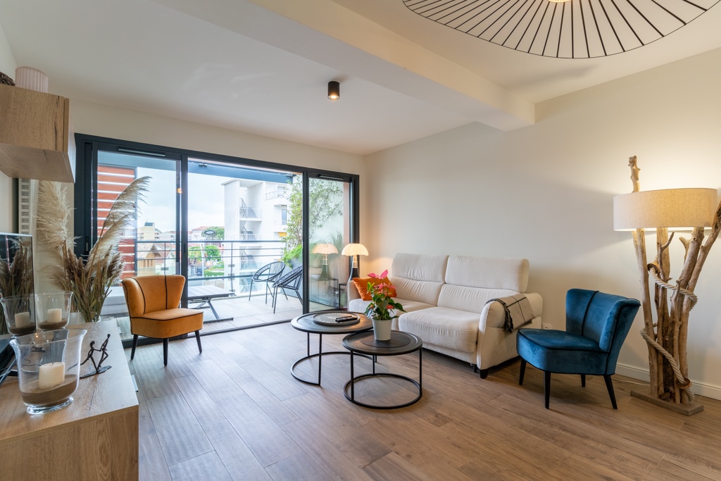 Son entrée avec placard. Agréable pièce à vivre avec TV, WIFI donnant sur un balcon qui vous offre une échappée sur le Bassin d'Arcachon.