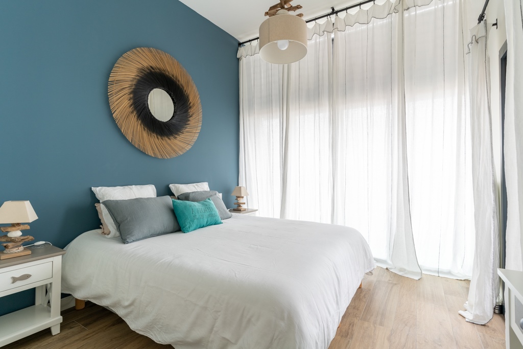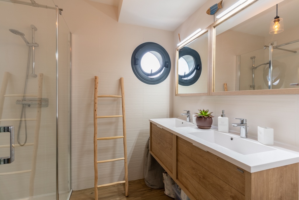 Son coin nuit avec deux chambres. La première avec un lit en 160 (ou 2x80) qui vous offre deux couchages et son placard donnant sur un petit balcon. Une salle d'eau avec douche à l'italienne et double vasque. La seconde chambre avec un grand lit en 180, également avec son placard, climatisée donnant sur le grand balcon. Un WC séparé avec lave mains et son lave-linge.