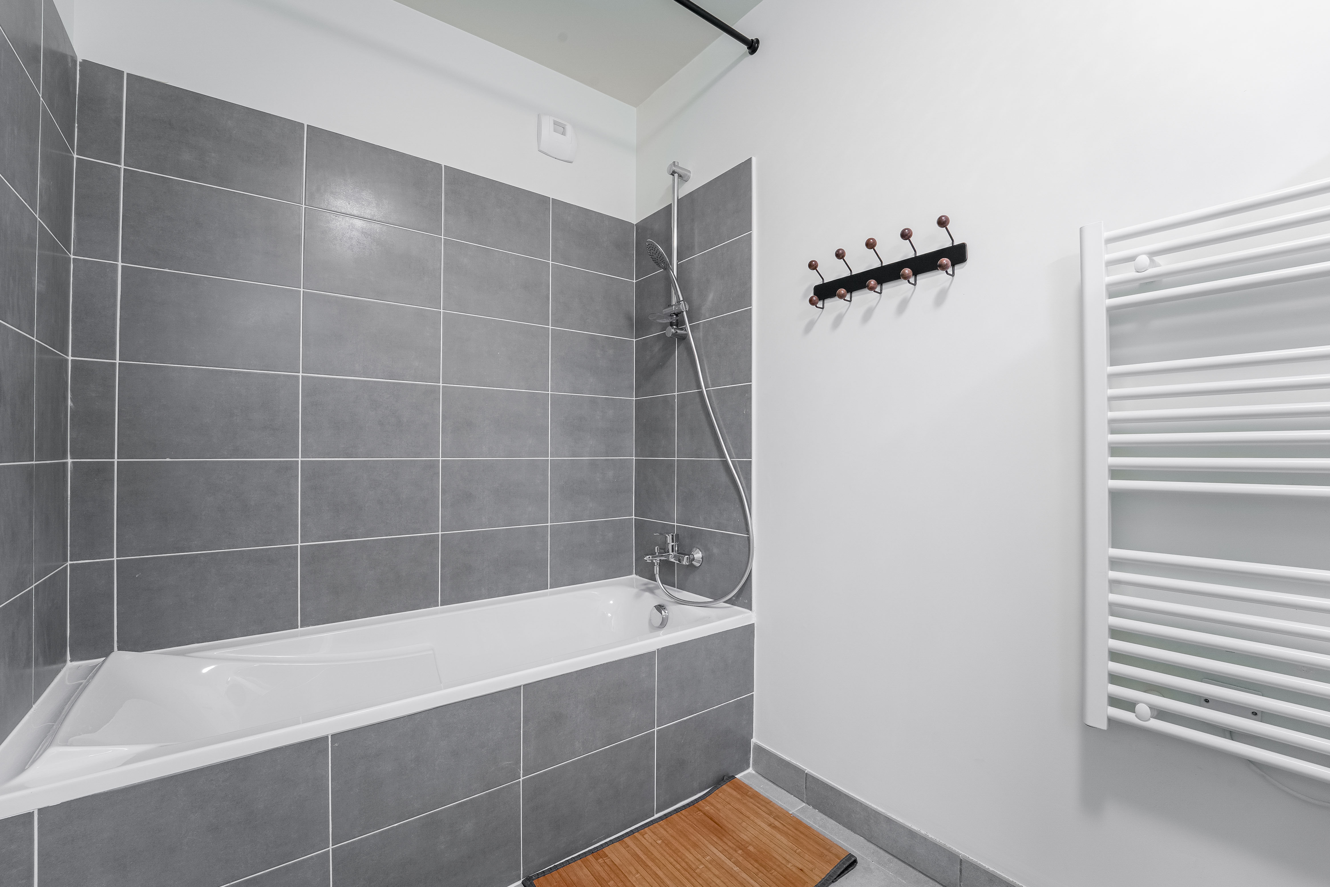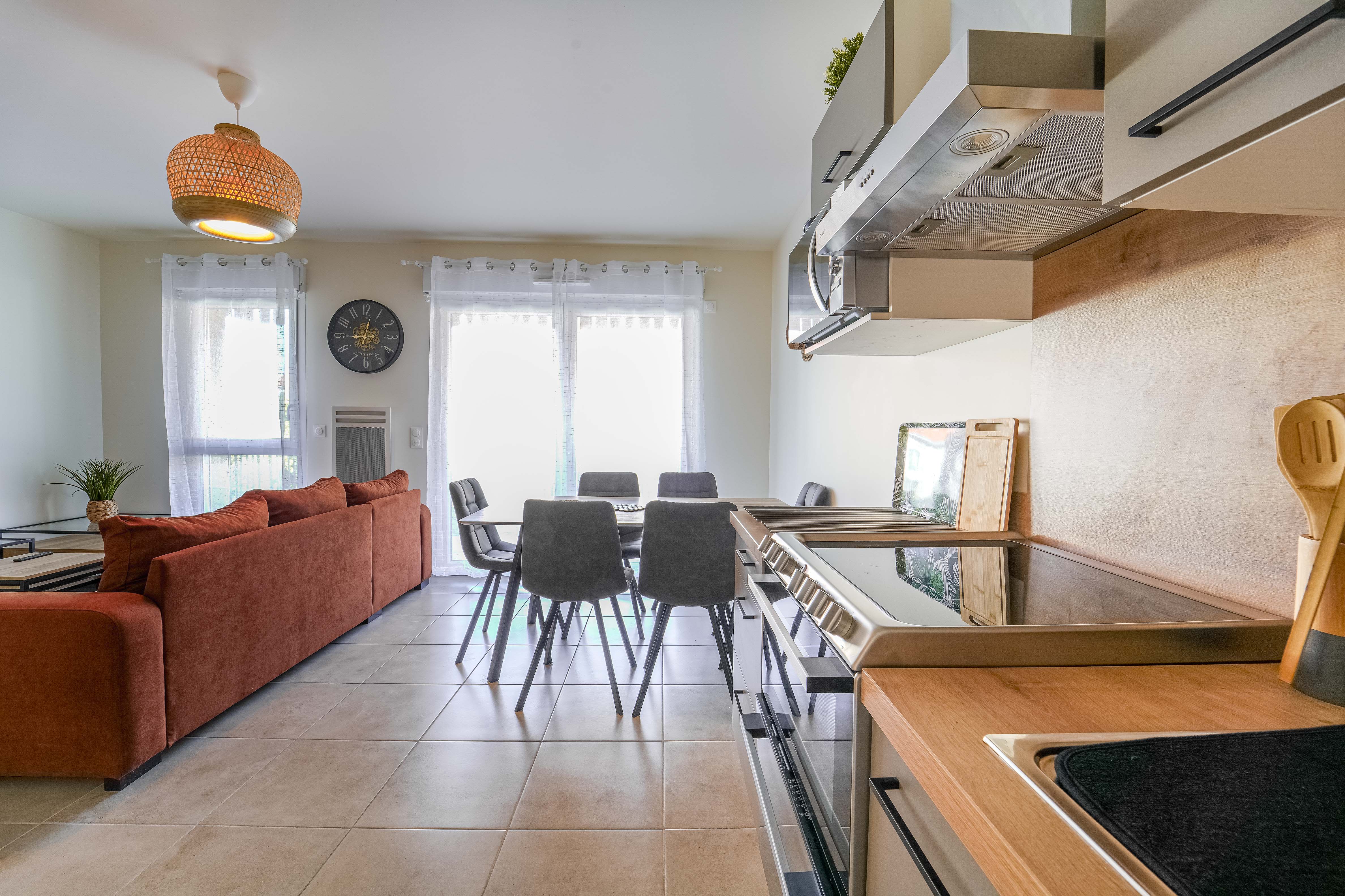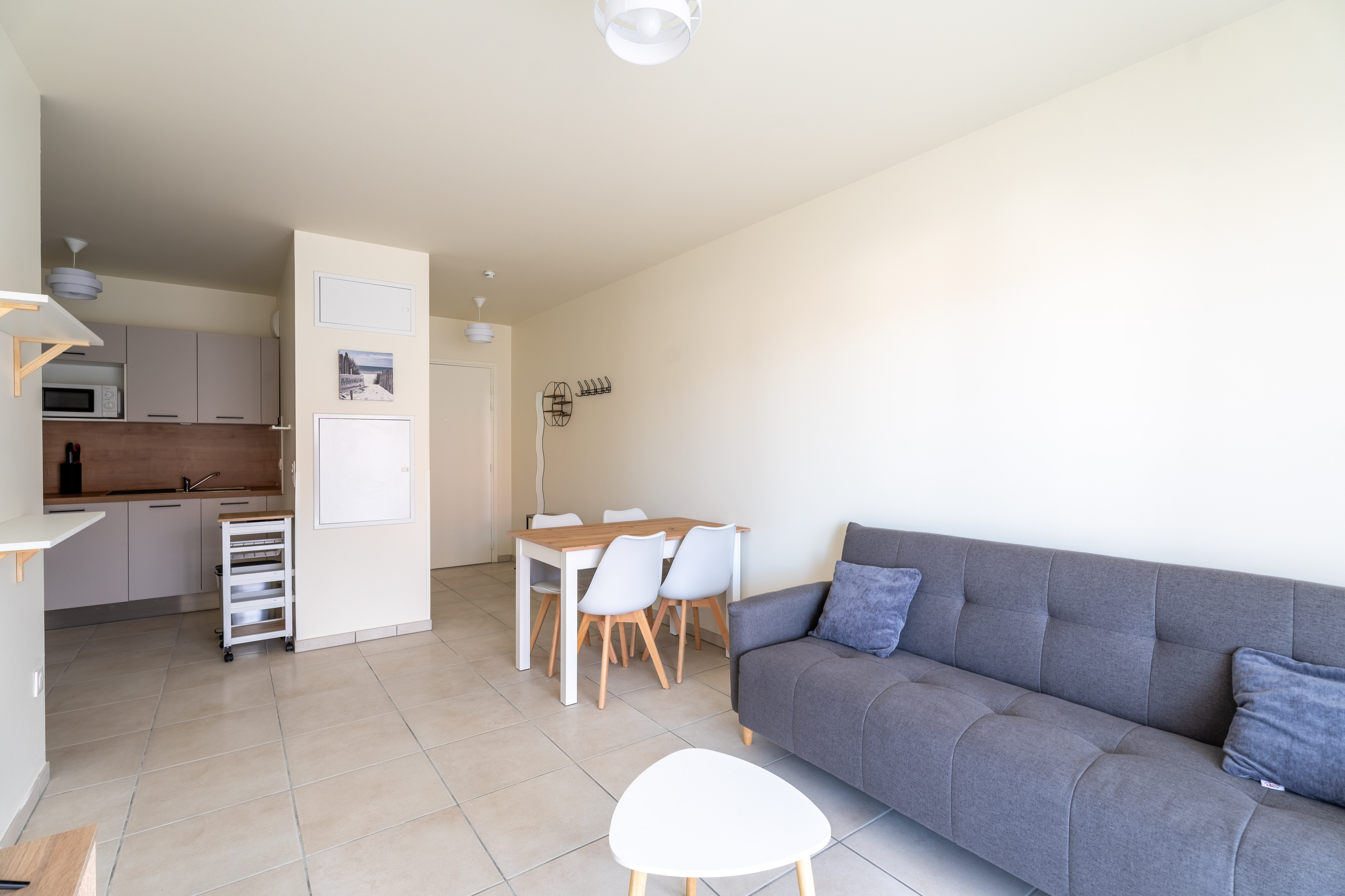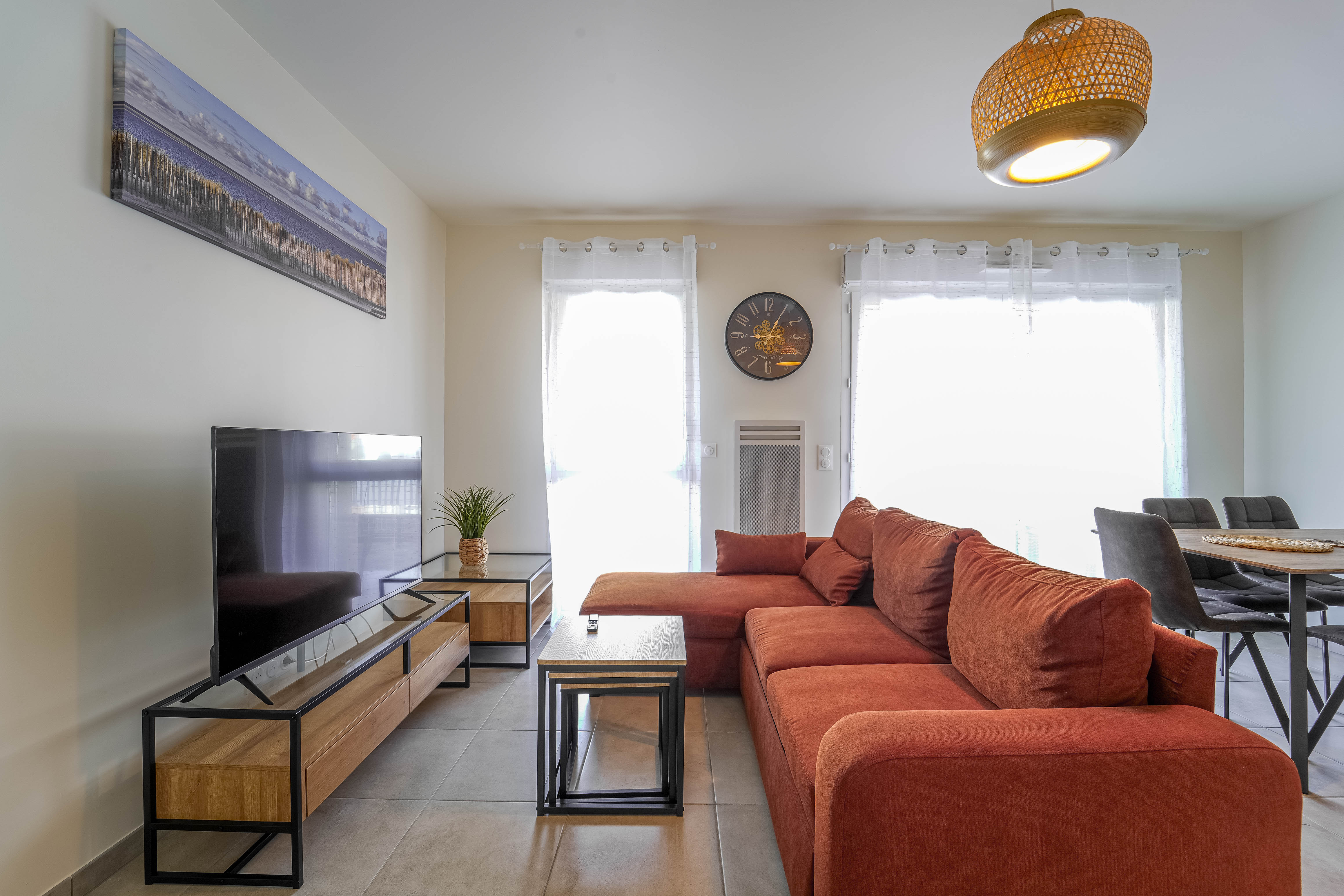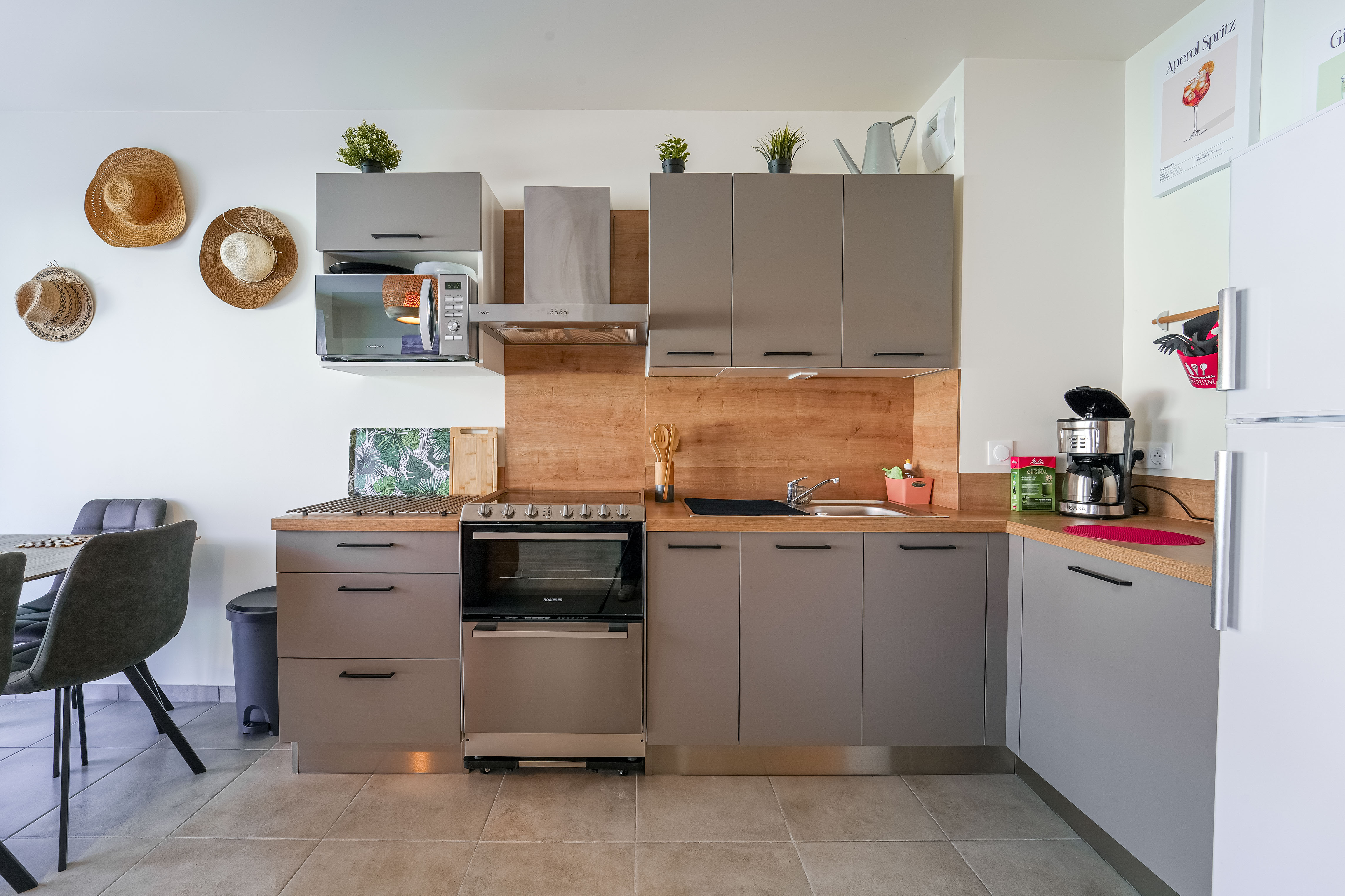 L’appartement se compose d’un séjour lumineux avec cuisine équipée. Vous y trouverez tout le nécessaire pour préparer vos repas : réfrigérateur-congélateur, four, micro-ondes, plaque de cuisson, cafetière filtre et grille-pain. Le séjour comprend également un coin salon avec canapé et télévision, parfait pour des moments de détente en famille ou entre amis.
