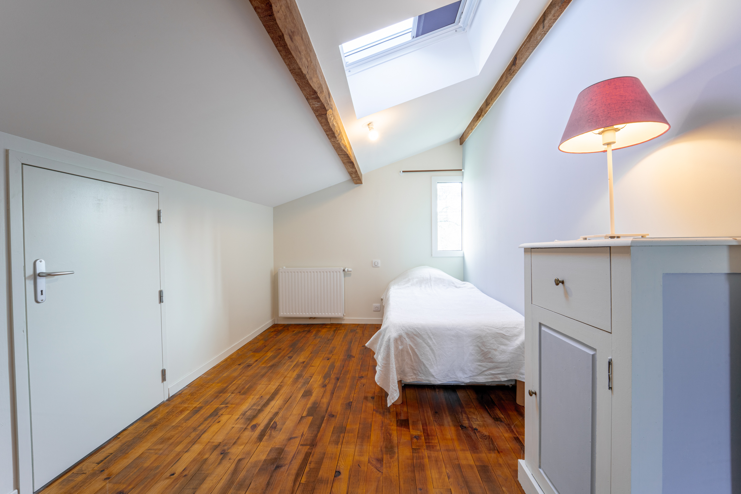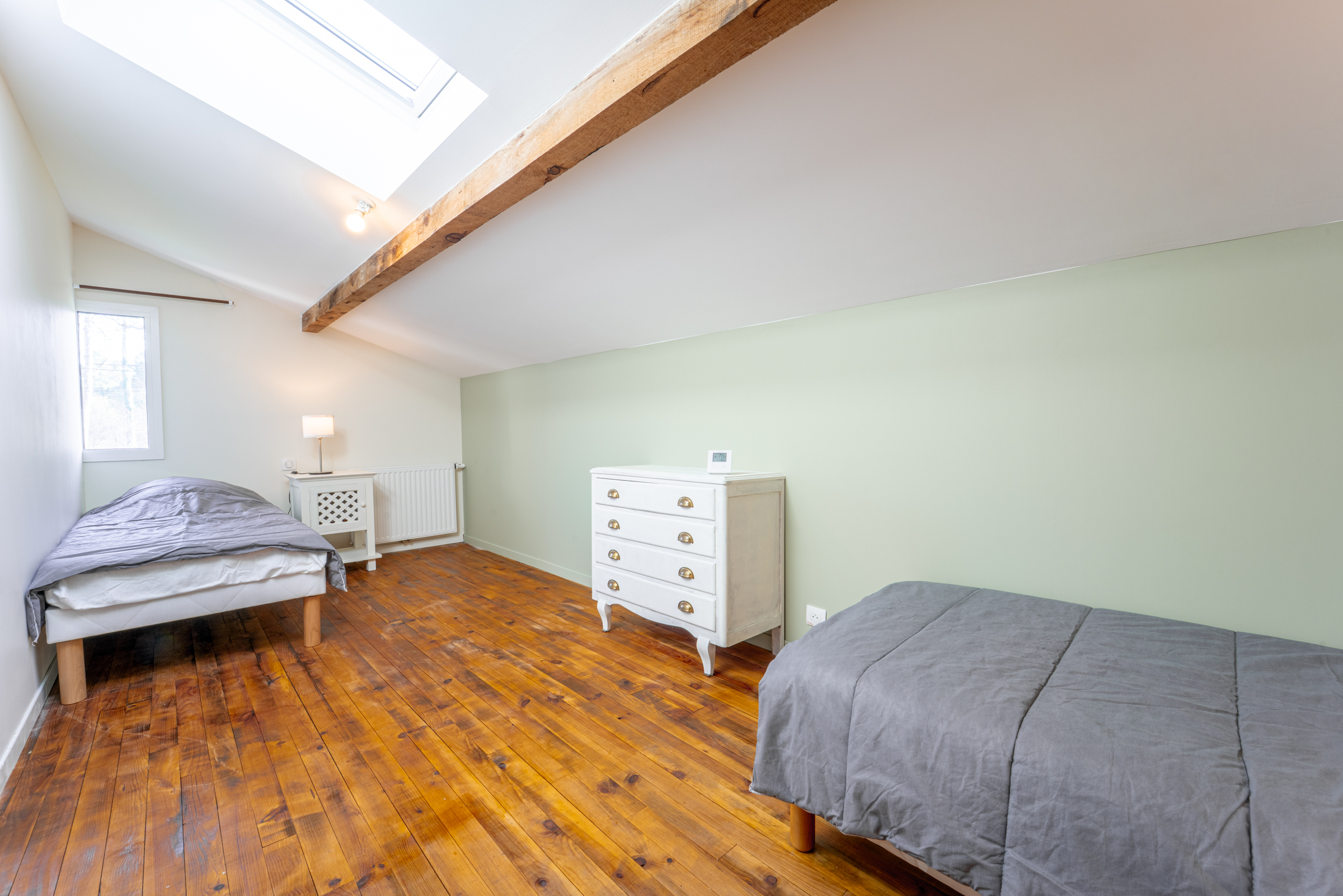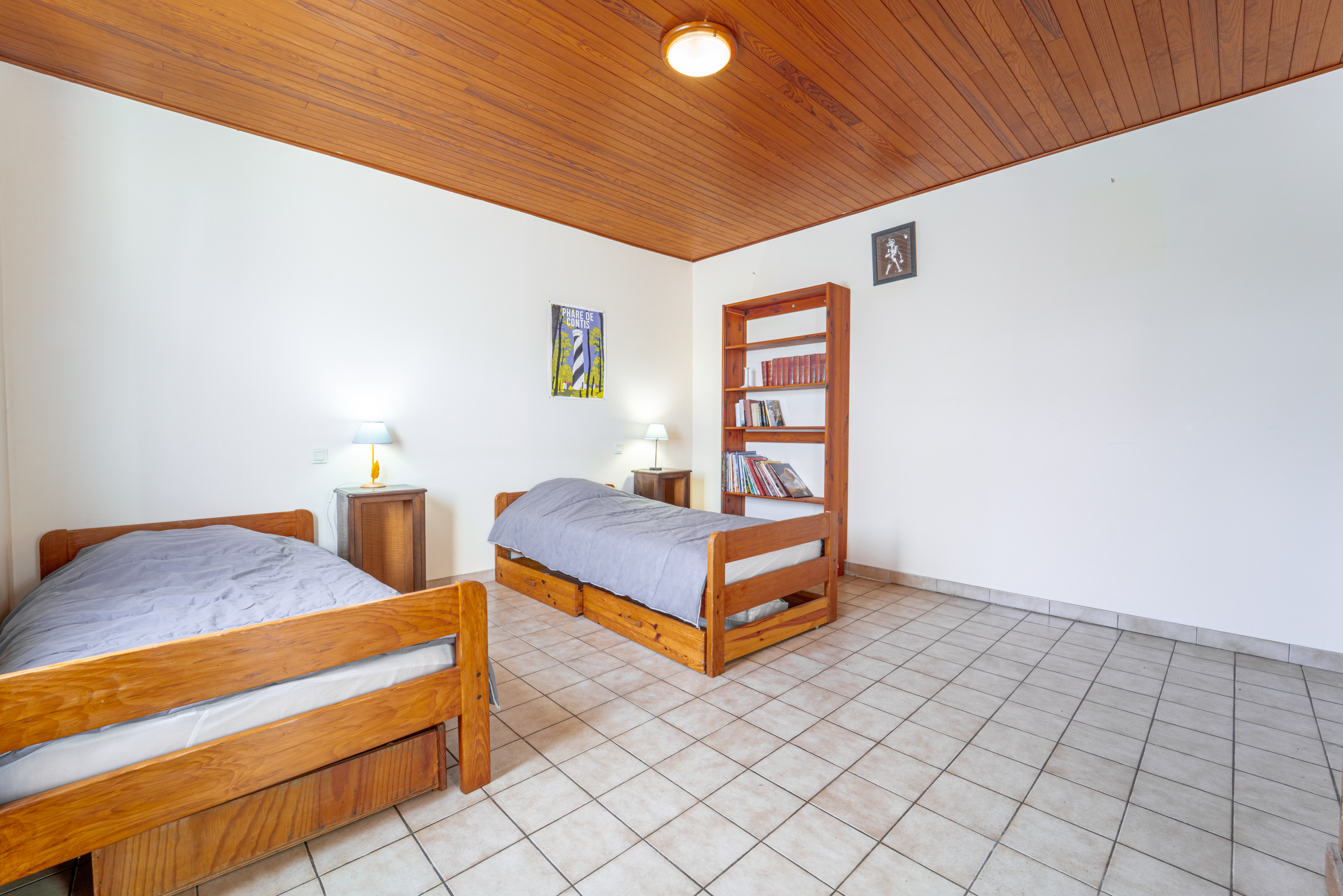 À l’étage, trois chambres supplémentaires sont aménagées et disposent d’un lit double et de trois lits simples. Une seconde salle de bains ainsi qu’un WC séparé complètent l’espace nuit et garantissent un confort optimal pour l’ensemble des occupants.