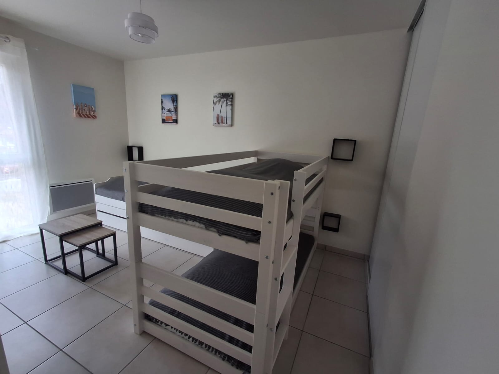 L'appartement se compose de deux chambres : une avec un lit double (140 cm) et l'autre avec des lits superposés (90 cm). Un lit gigogne (90 cm), qui se transforme en lit double, complète l’aménagement pour offrir un total de 6 couchages.