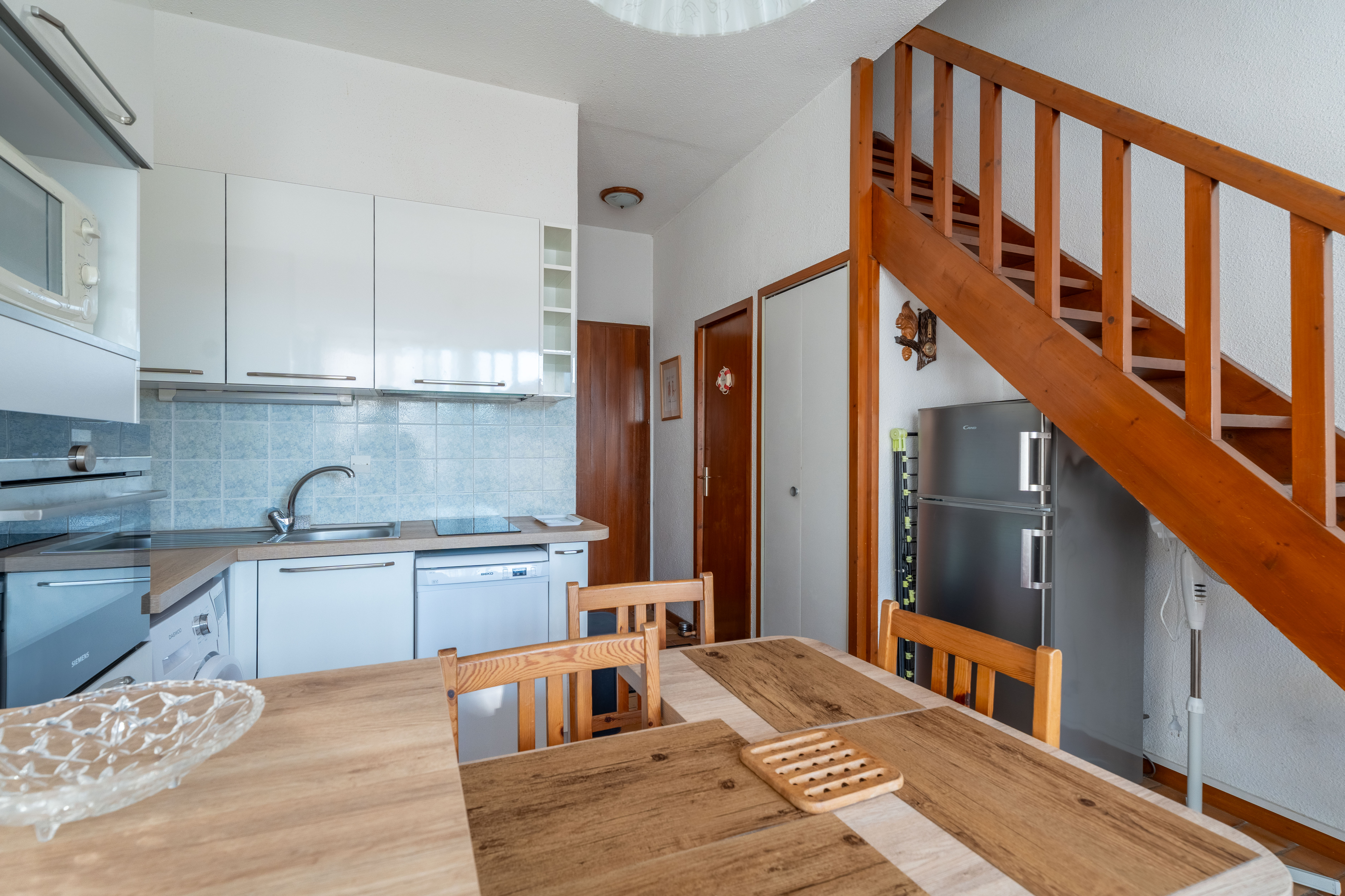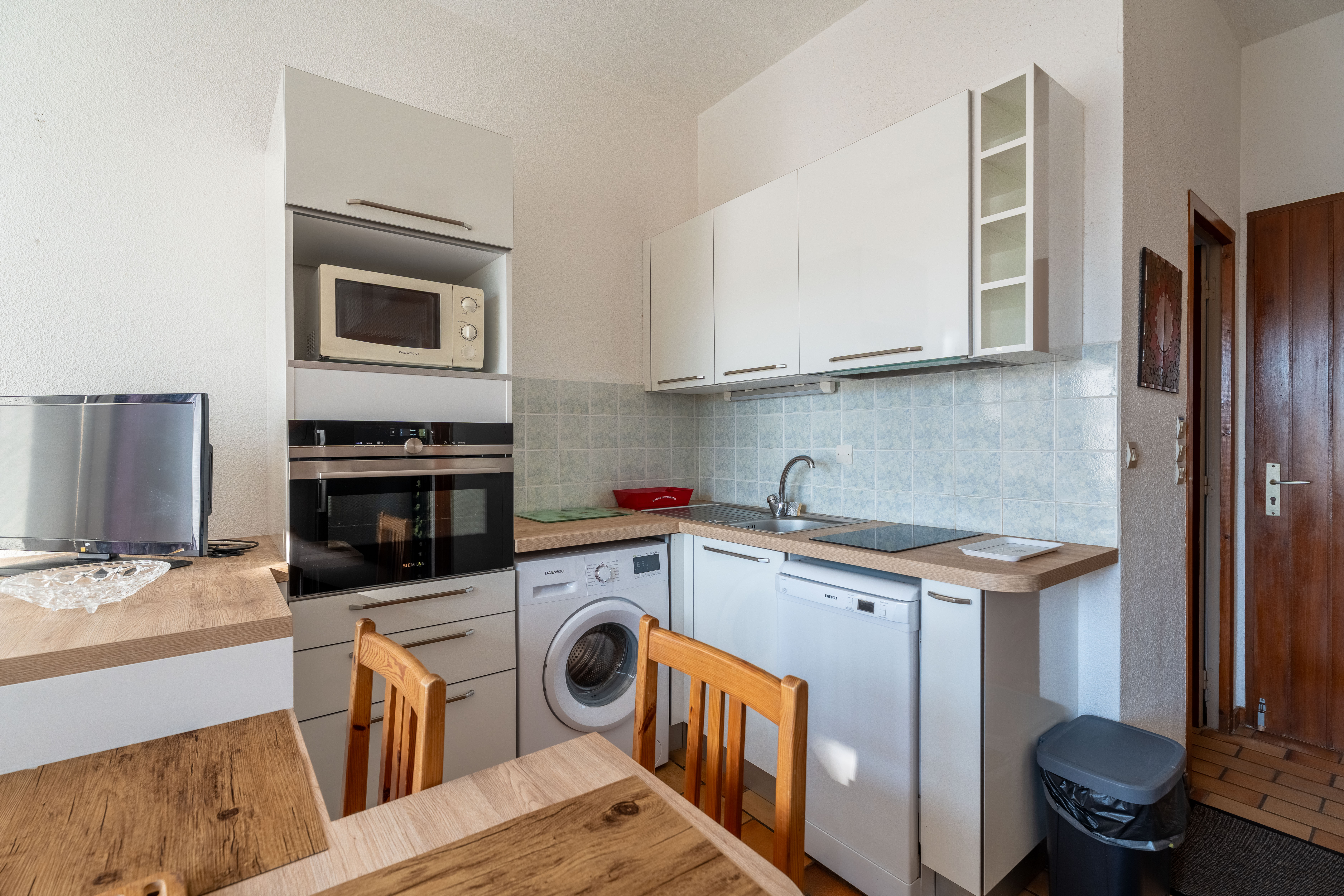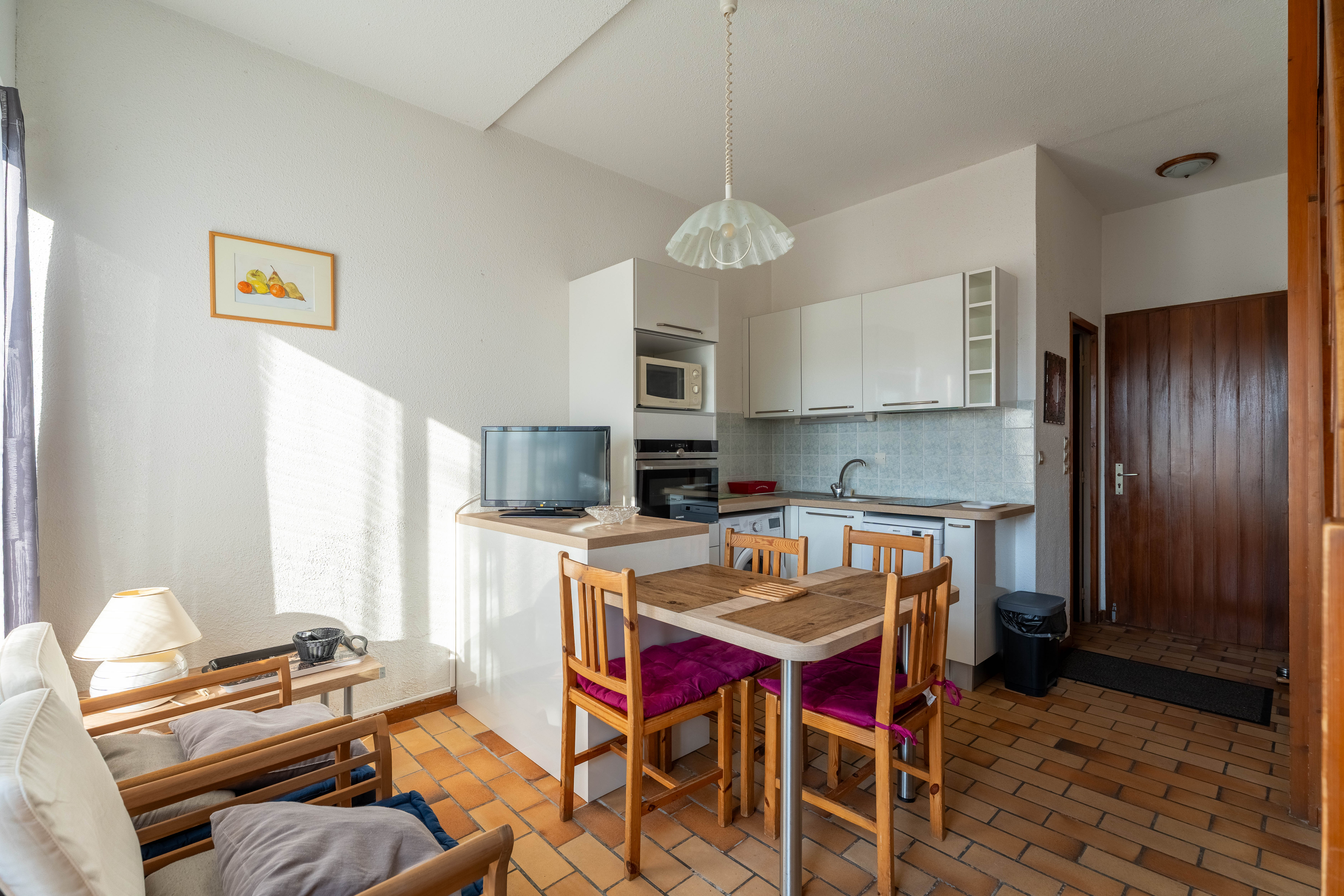 L’appartement se compose d’une entrée menant à un séjour lumineux avec télévision. (À noter : pas de WIFI, mais possibilité de louer un boîtier.) Un ventilateur est également à disposition pour plus de confort durant les journées estivales. La cuisine ouverte, entièrement équipée, vous permettra de préparer vos repas en toute simplicité : four, micro-ondes, lave-vaisselle, cafetière, bouilloire, grille-pain et tous les ustensiles nécessaires.
