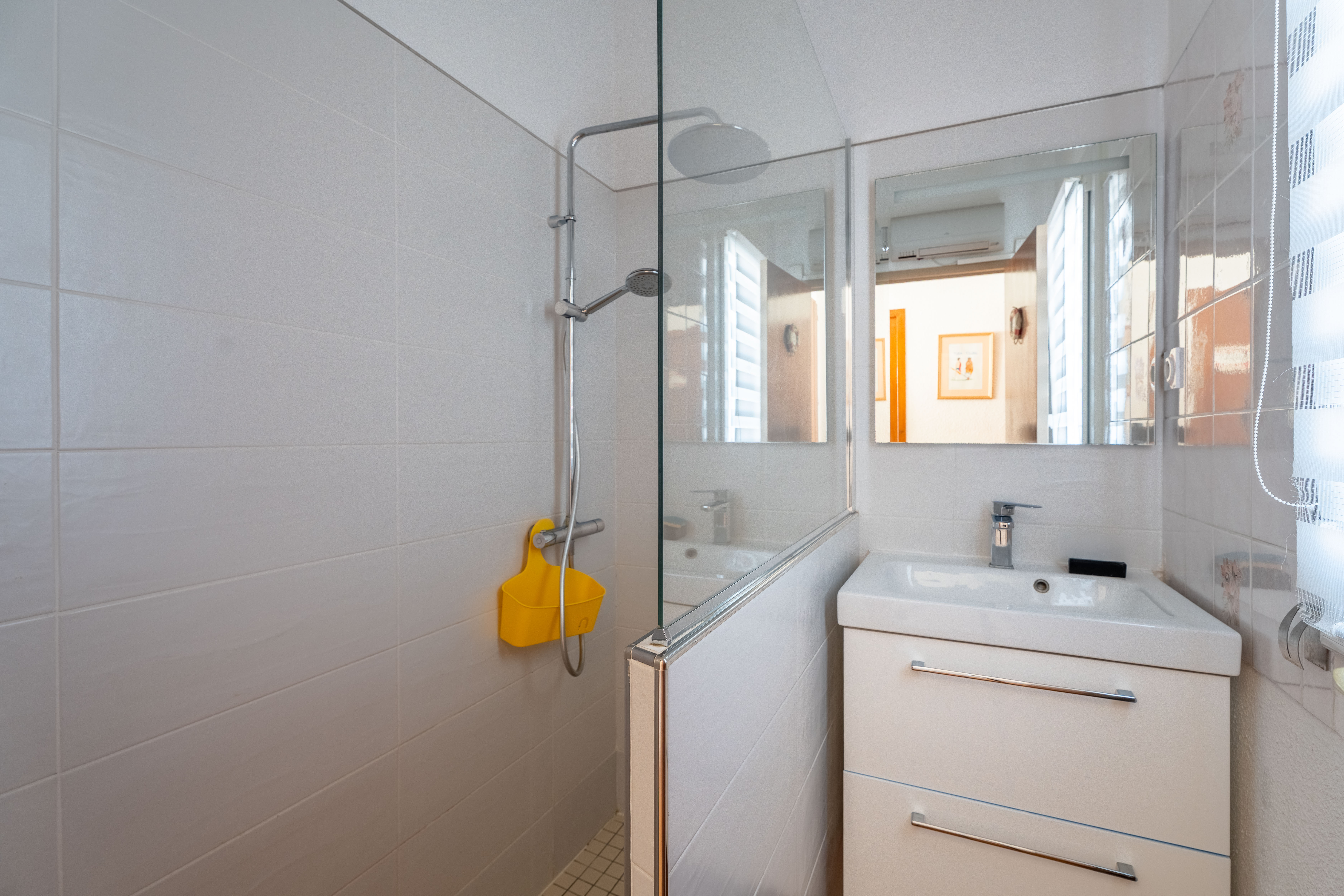 Une salle d’eau avec douche, lavabo et sèche-cheveux ainsi qu’un WC séparé complètent l’ensemble.