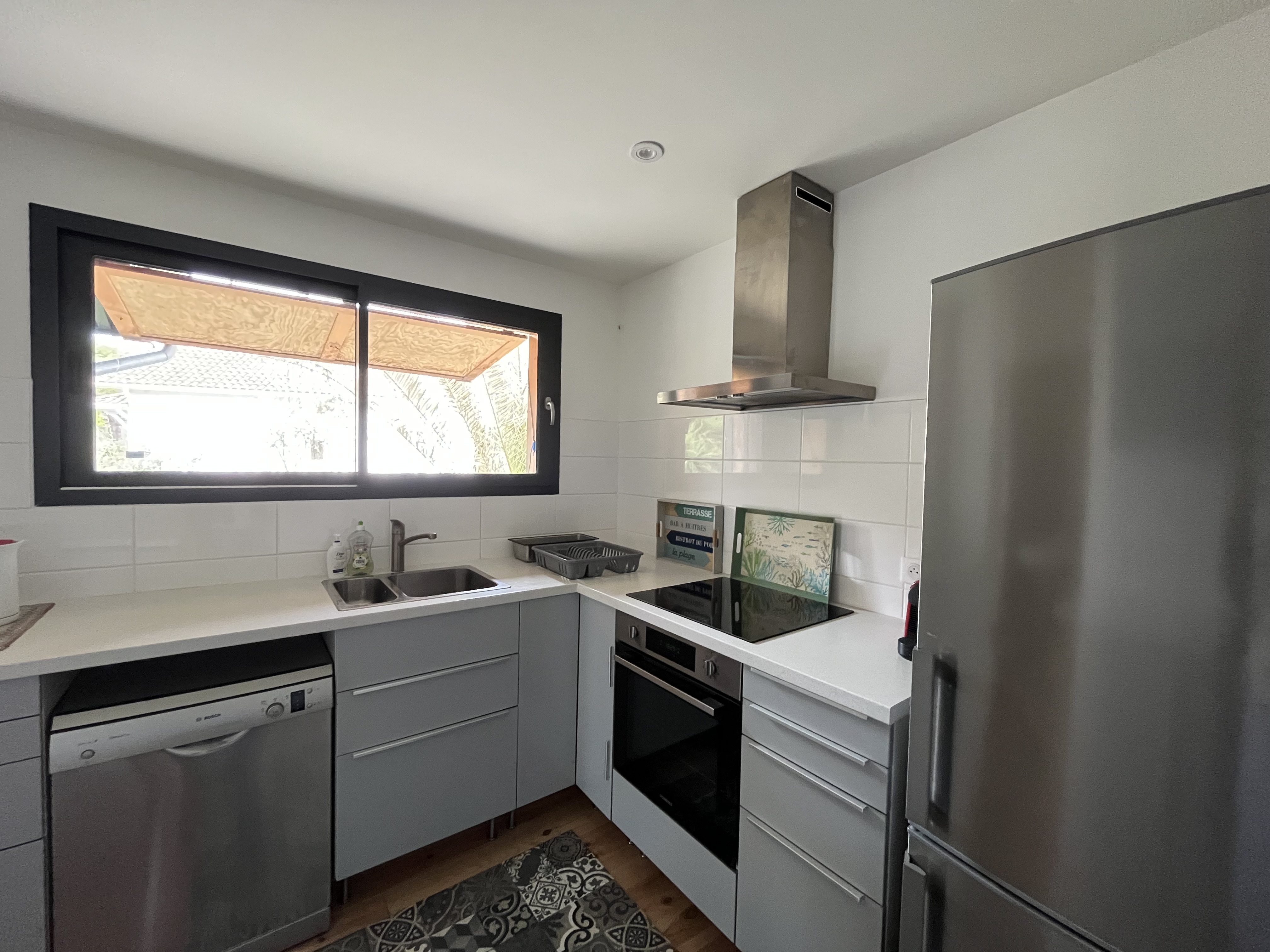 La cuisine ouverte est entièrement équipée avec plaques à induction, four, micro-ondes, lave-vaisselle, réfrigérateur/congélateur, cafetière, bouilloire, grille-pain et tout le nécessaire de cuisine.