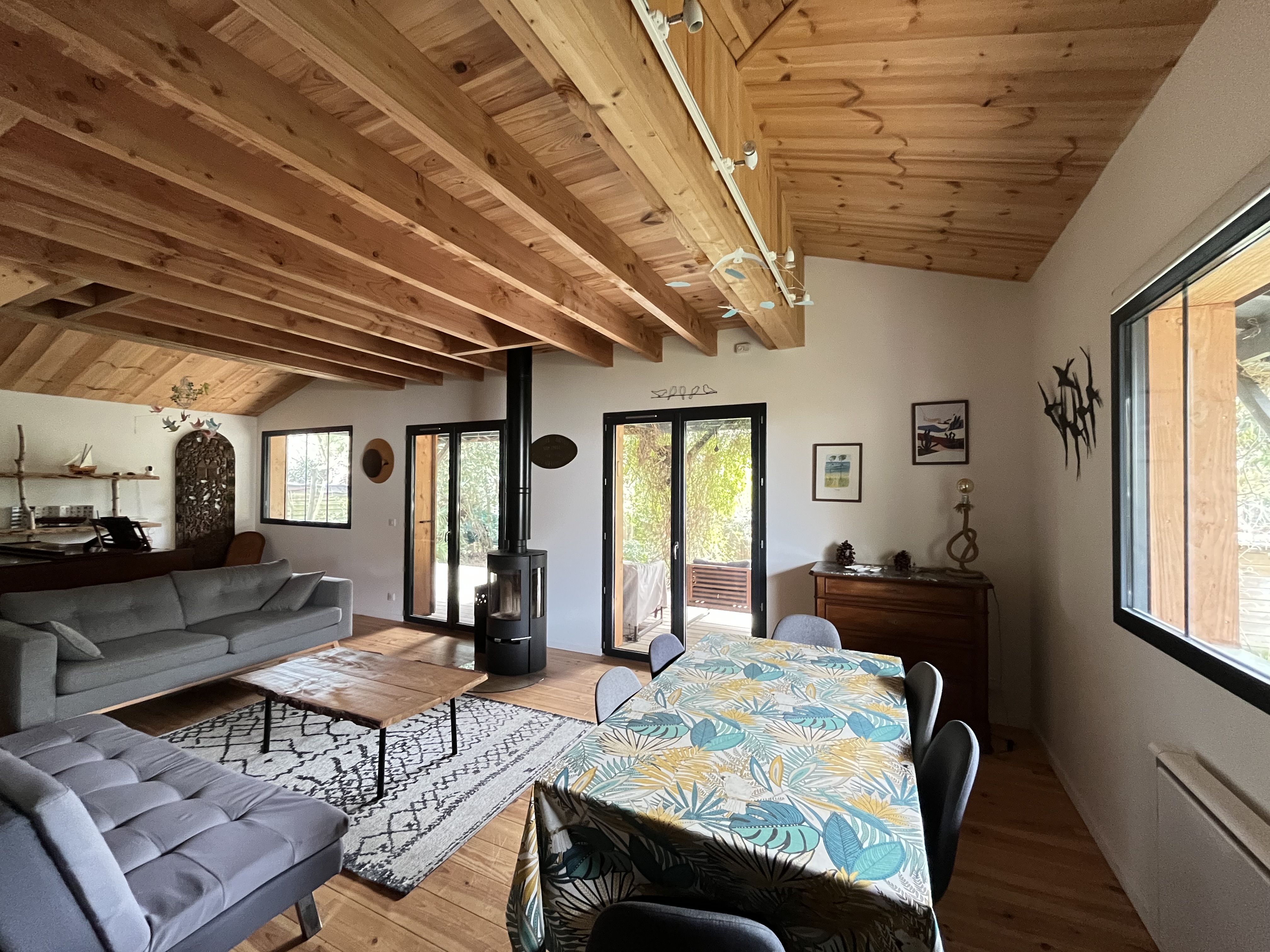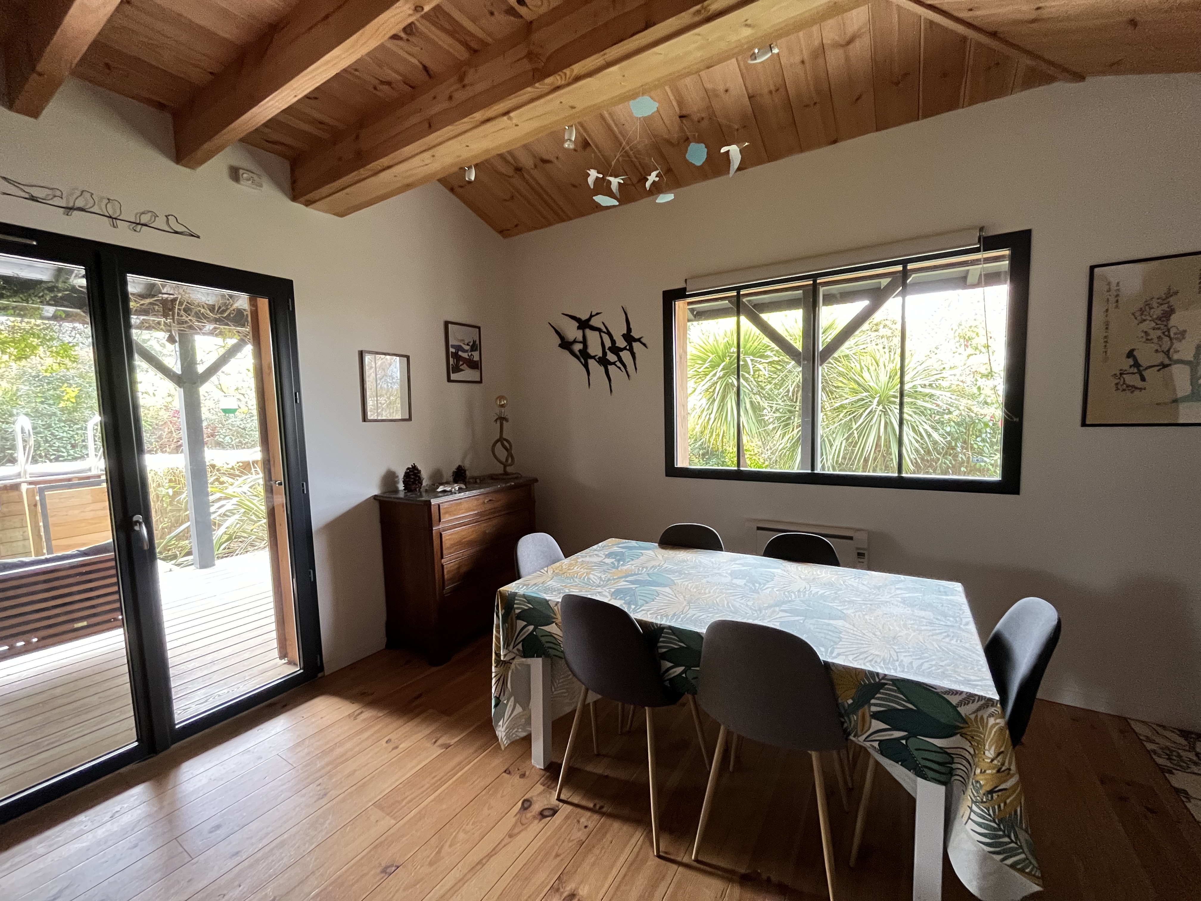 À l’extérieur, vous profiterez d’une terrasse aménagée avec mobilier de jardin, idéale pour partager vos repas, ainsi que d’une piscine au chlore sécurisée par une couverture, pour des moments de détente en toute sérénité.