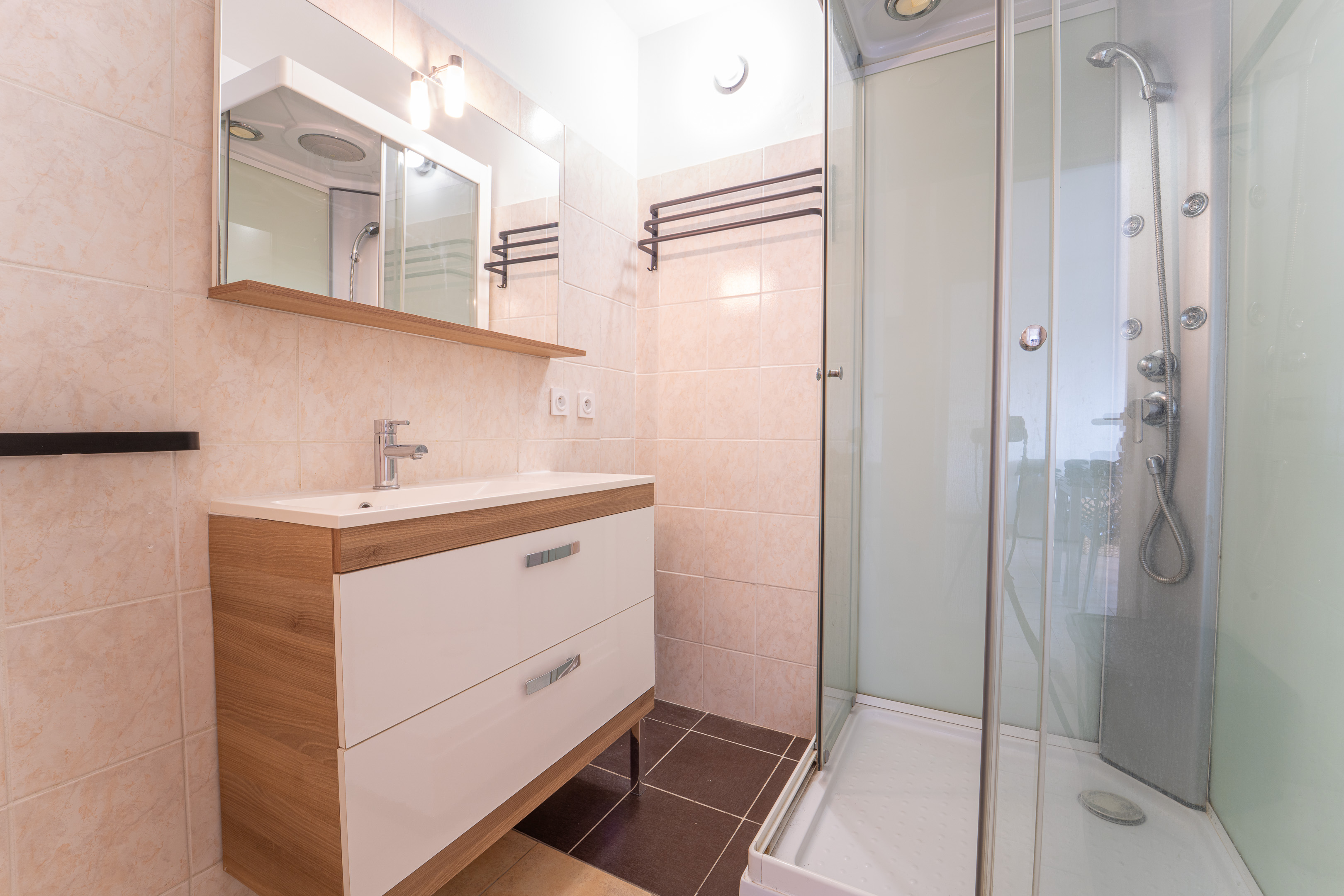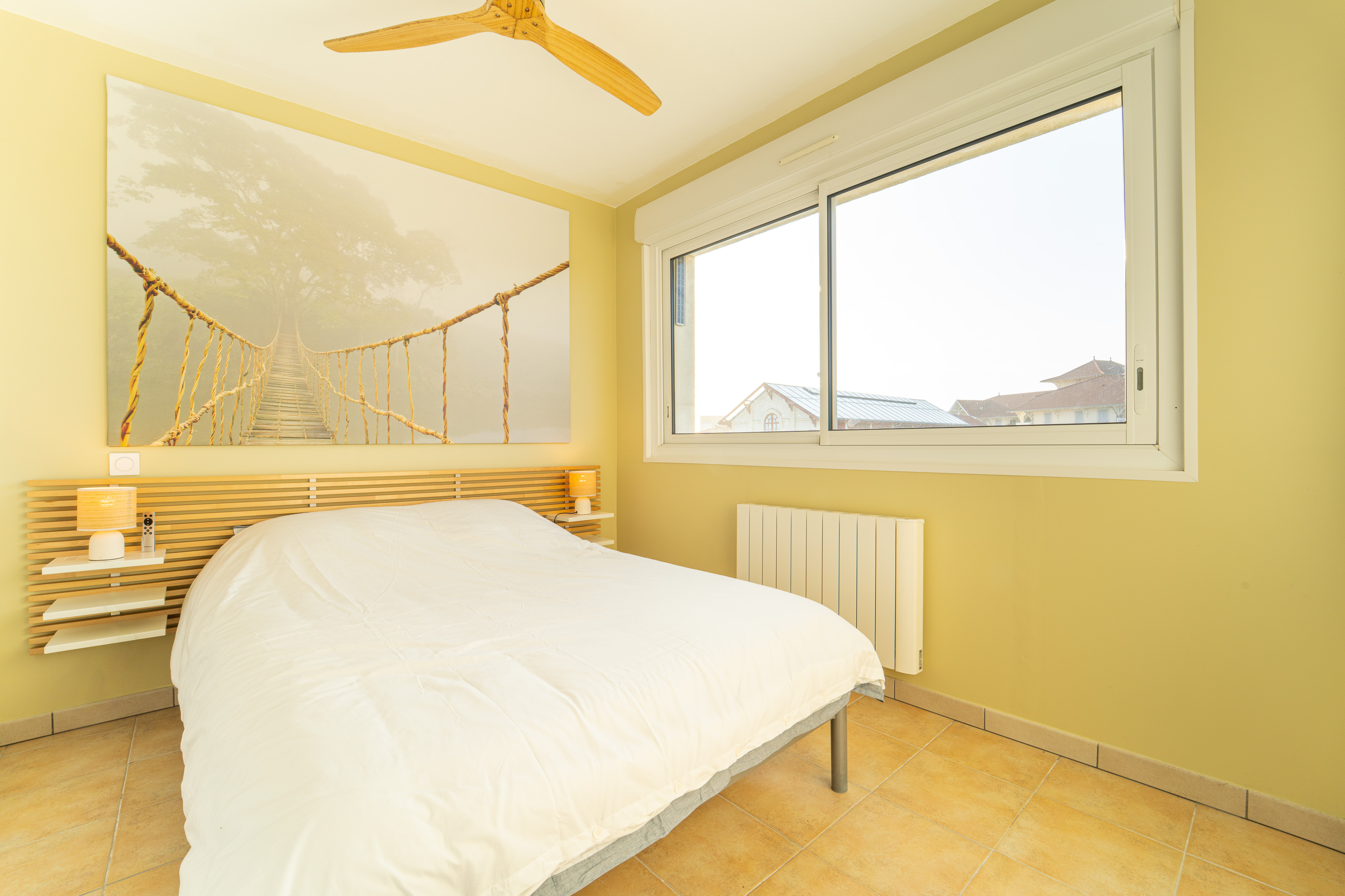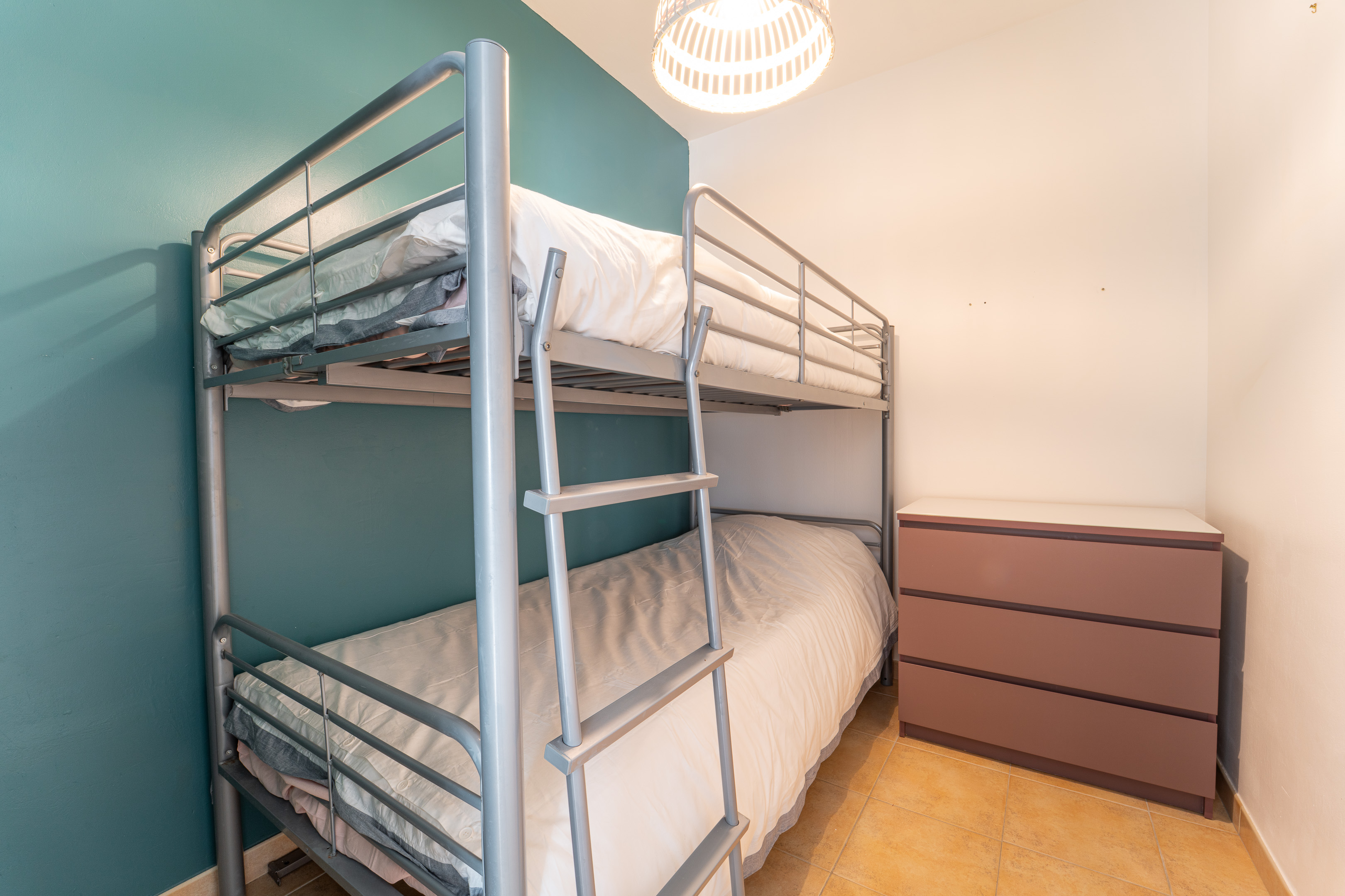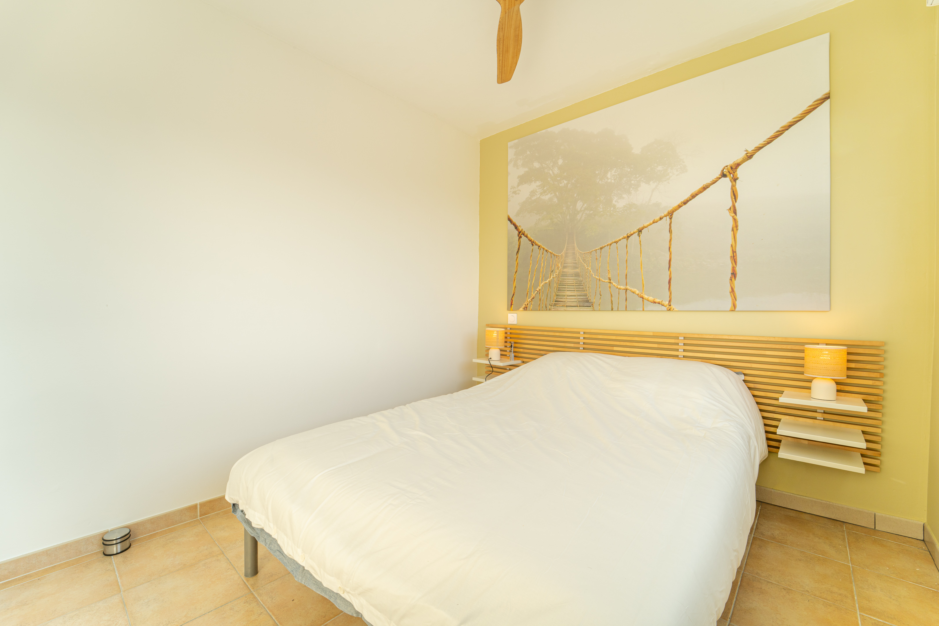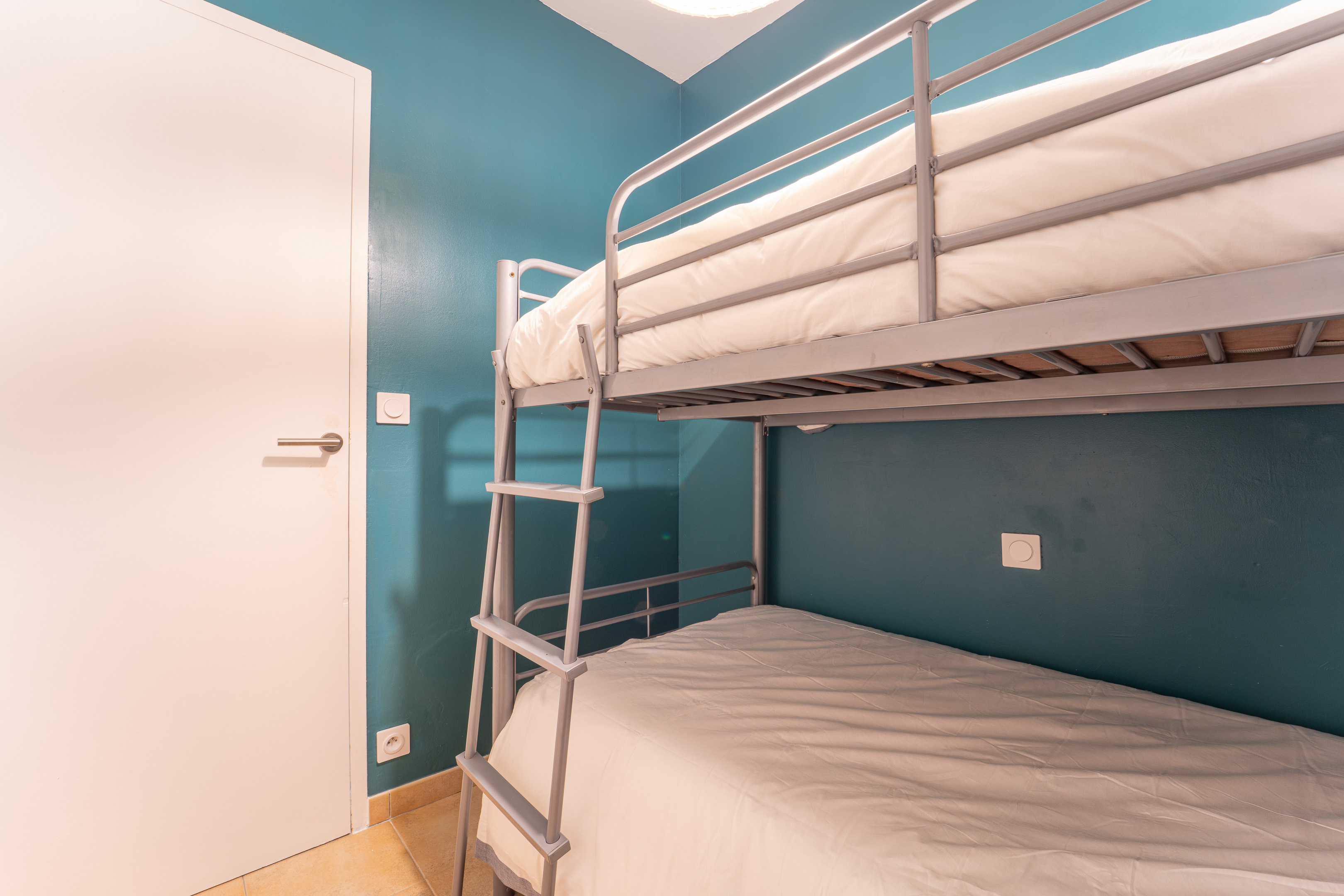 La chambre principale, baignée de soleil et accueillante, est équipée d’un lit double pour des nuits reposantes. Un coin nuit séparé astucieusement aménagé offre deux lits superposés en 90. La salle d’eau est équipée d’une douche et de WC.