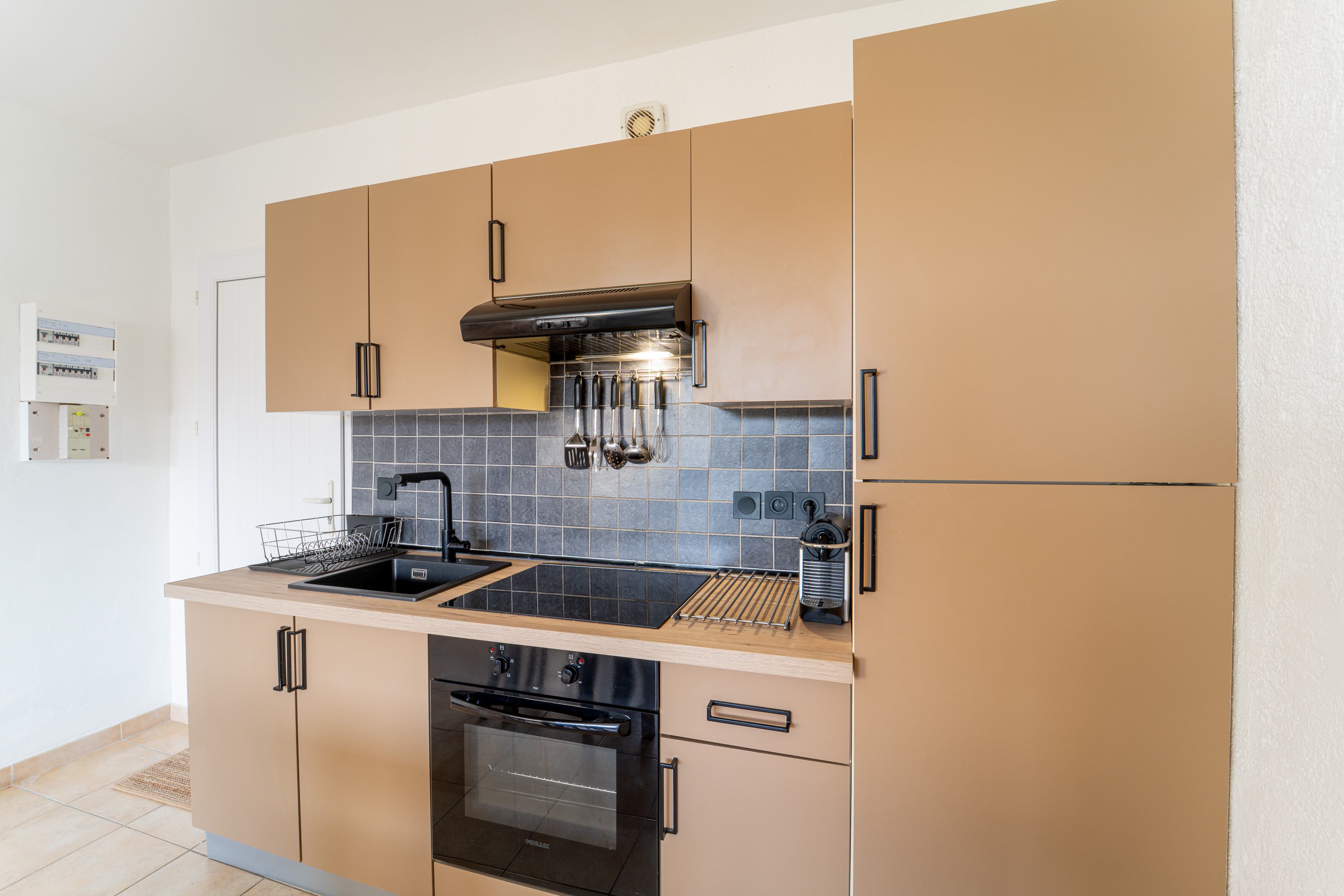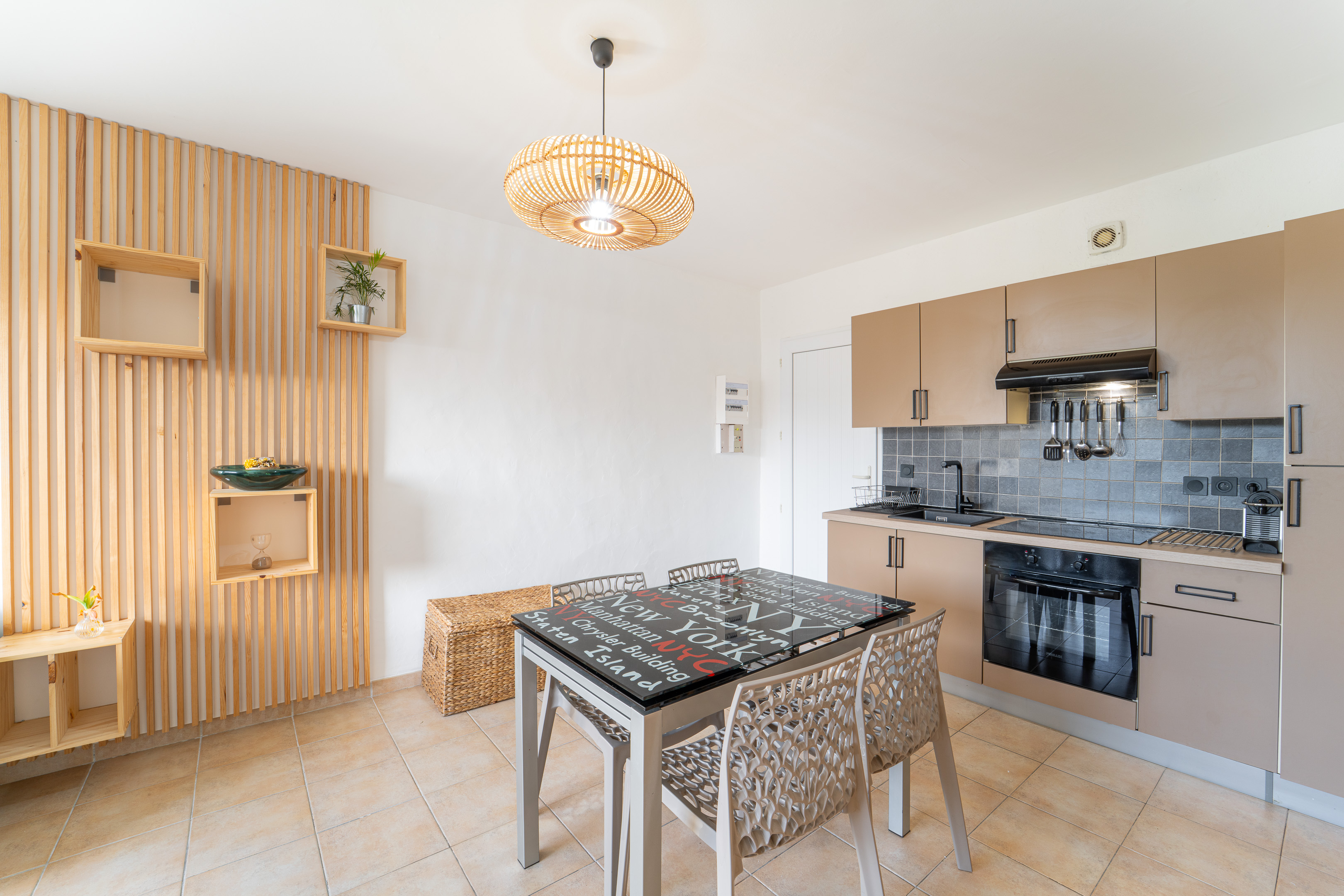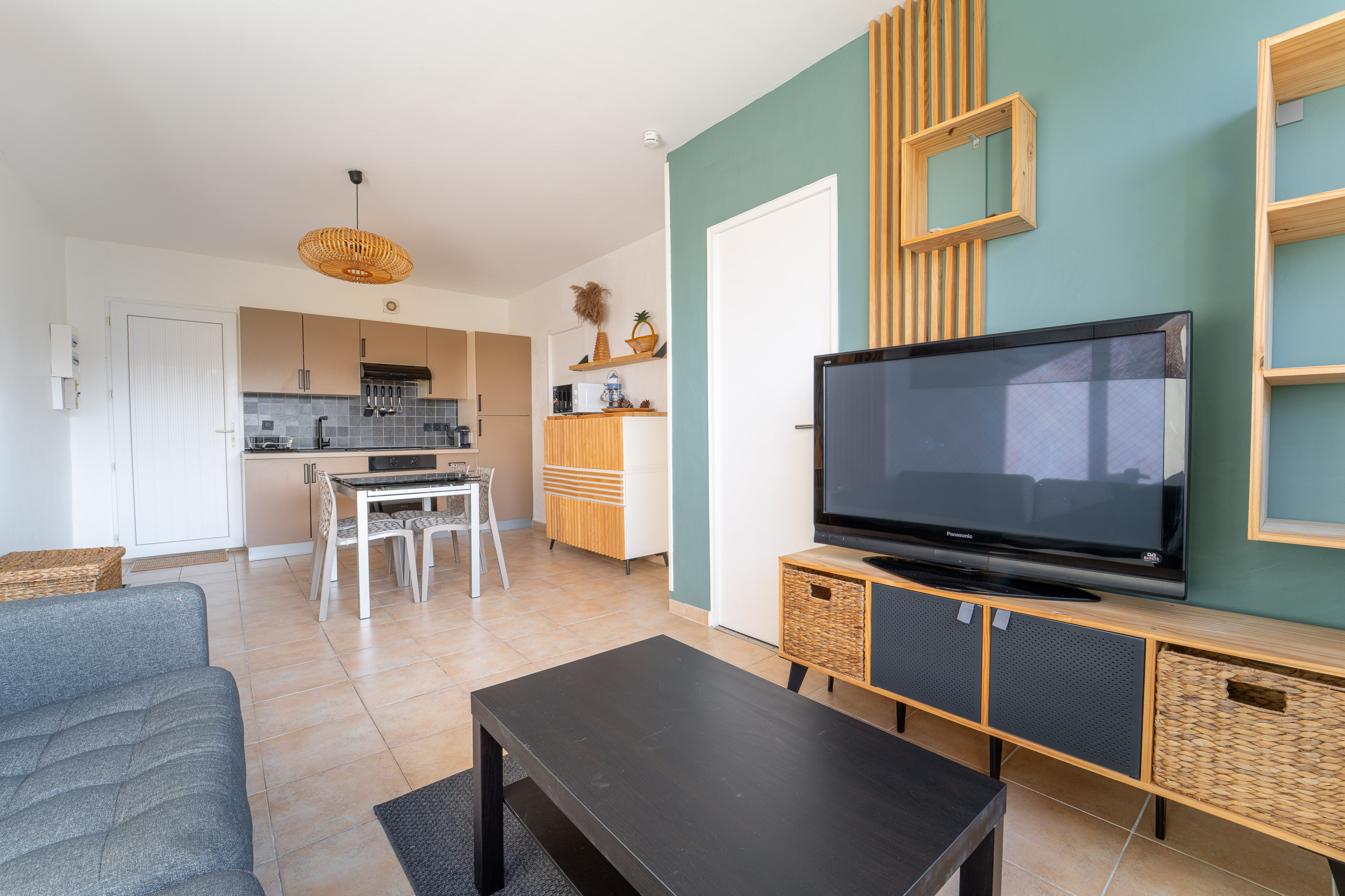 La pièce de vie lumineuse, invite à la convivialité : cuisine moderne entièrement équipée (réfrigérateur/congélateur, plaque de cuisson, four, bouilloire, cafetière, grille-pain) pour préparer vos repas après la plage, espace salon cosy avec canapé, télévision écran plat et WIFI pour vos moments de repos ou de partage.